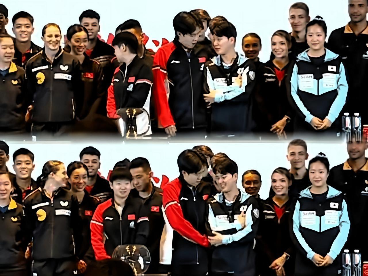 大合照环节可太有意思了! 头哥和男明星正好挨着站, 俩人从头聊到尾, 笑得那叫一个开心~ 头头这调皮劲儿又上来了, 不仅贴得近近的, 还伸手rua了把人家的肚子, 这互动也太自然了吧! 看得出来他是真喜欢这位男明星, 俩人那股熟稔劲儿, 简直像认识了十几年似的~ 莎莎也是全程小嘴叭叭的, 不管站在哪个位置, 都能看到她跟人聊得热络,可爱死了! 不得不说, 这次团体赛抽签的氛围真的太棒了! 阳光洒下来, 每个人都笑得特别真诚, 感觉整个场子都暖融融的。 莎头组合, 比赛一定要顺顺利利,健康完赛呀!