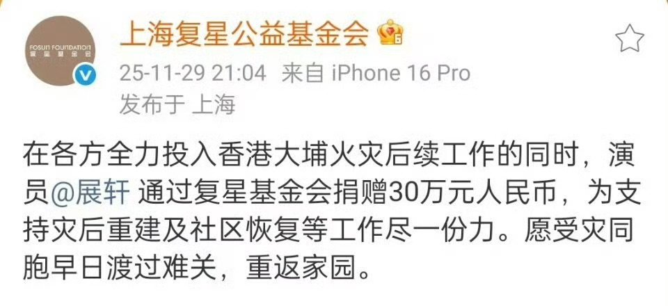 展轩捐款30万展轩向香港捐款30万 展轩 通过复星基金会捐赠30万元人民币,为支持灾后重建及社区恢复等工作尽一份力。愿受灾同胞早日渡过难关