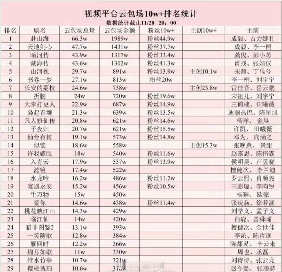 视频平台云包场10w+排名统计来了,真没想到排名前三的剧集里面,成毅就直接占领了两部啊,这个云包场号召力很强了