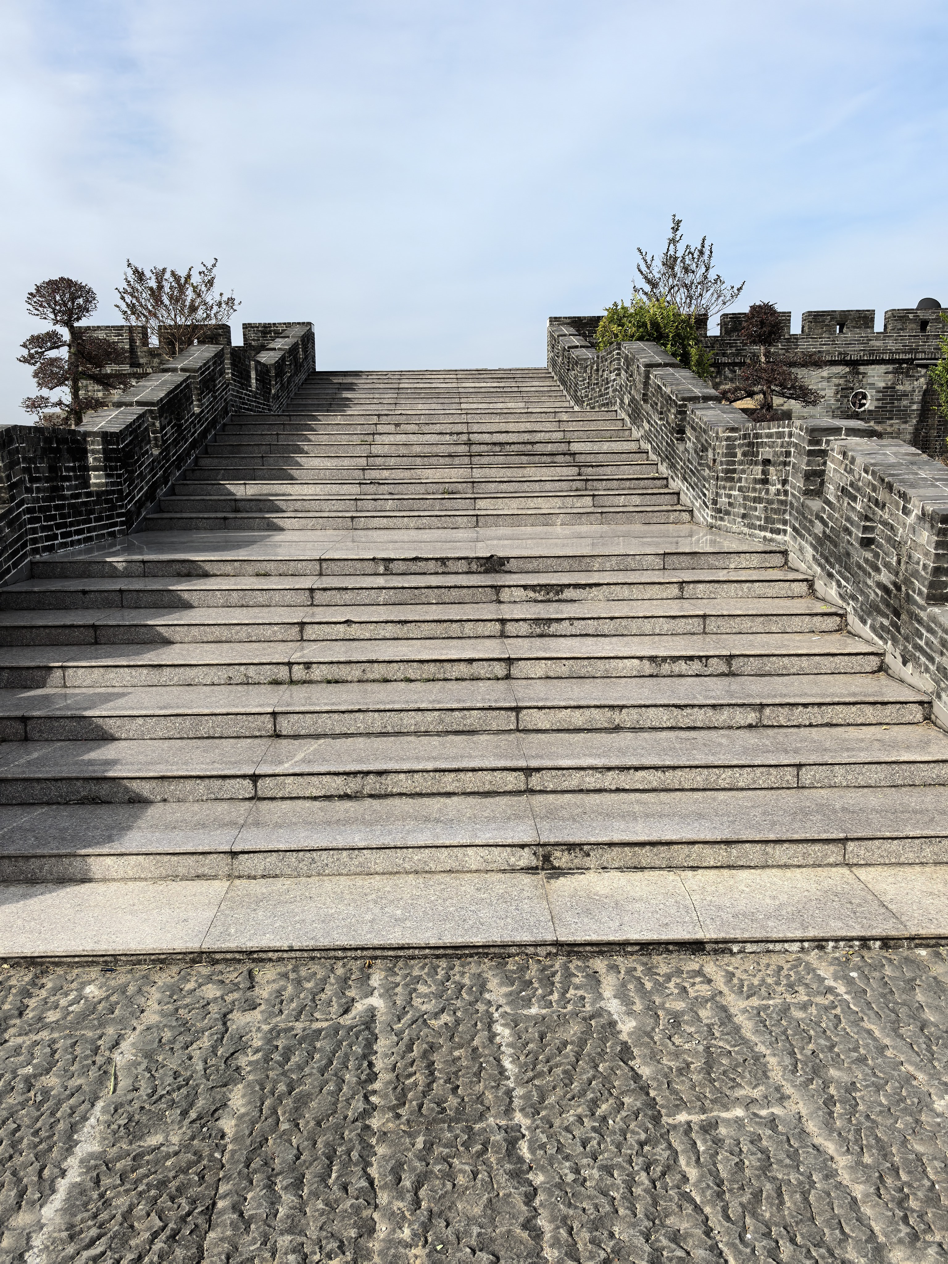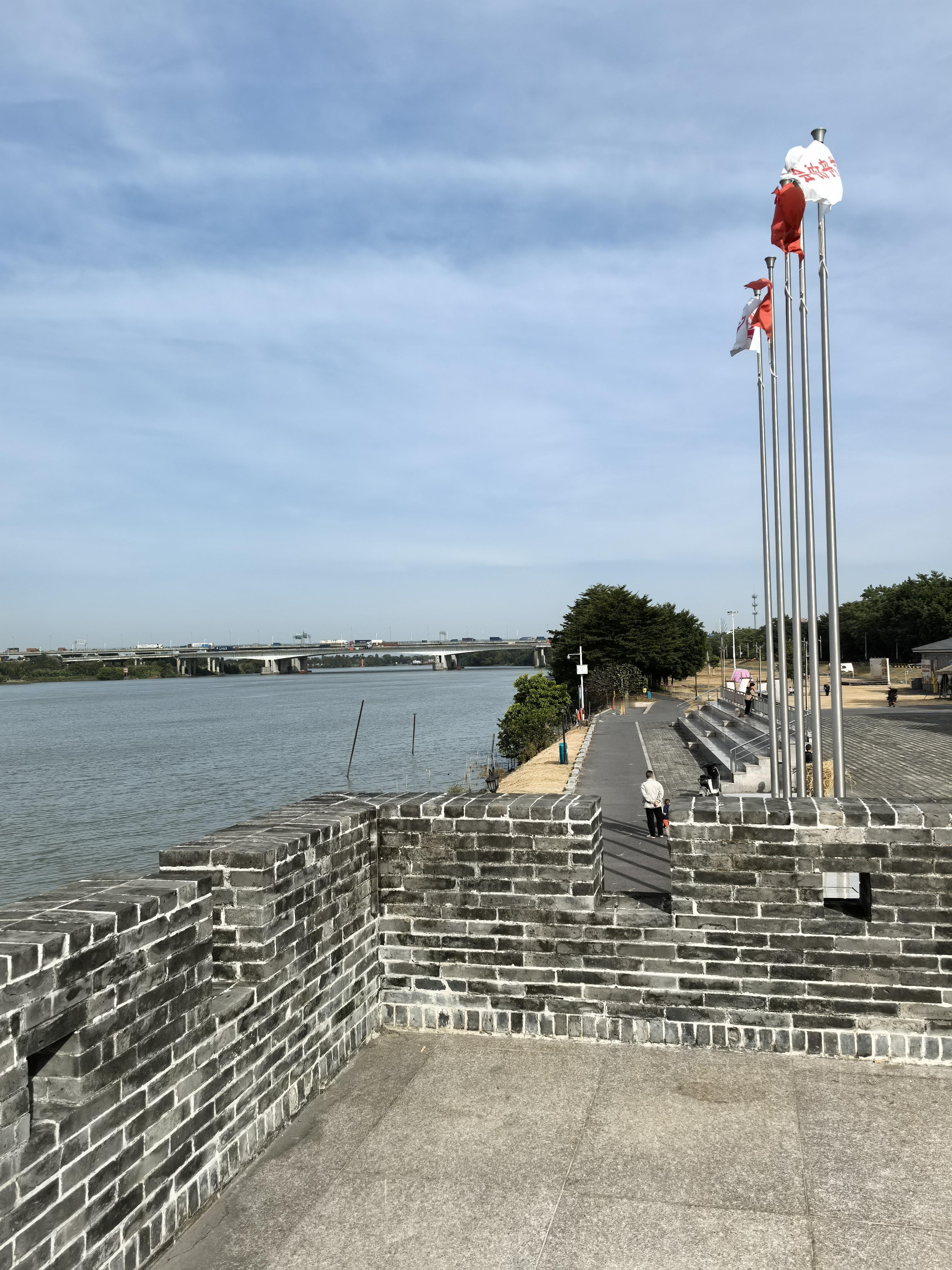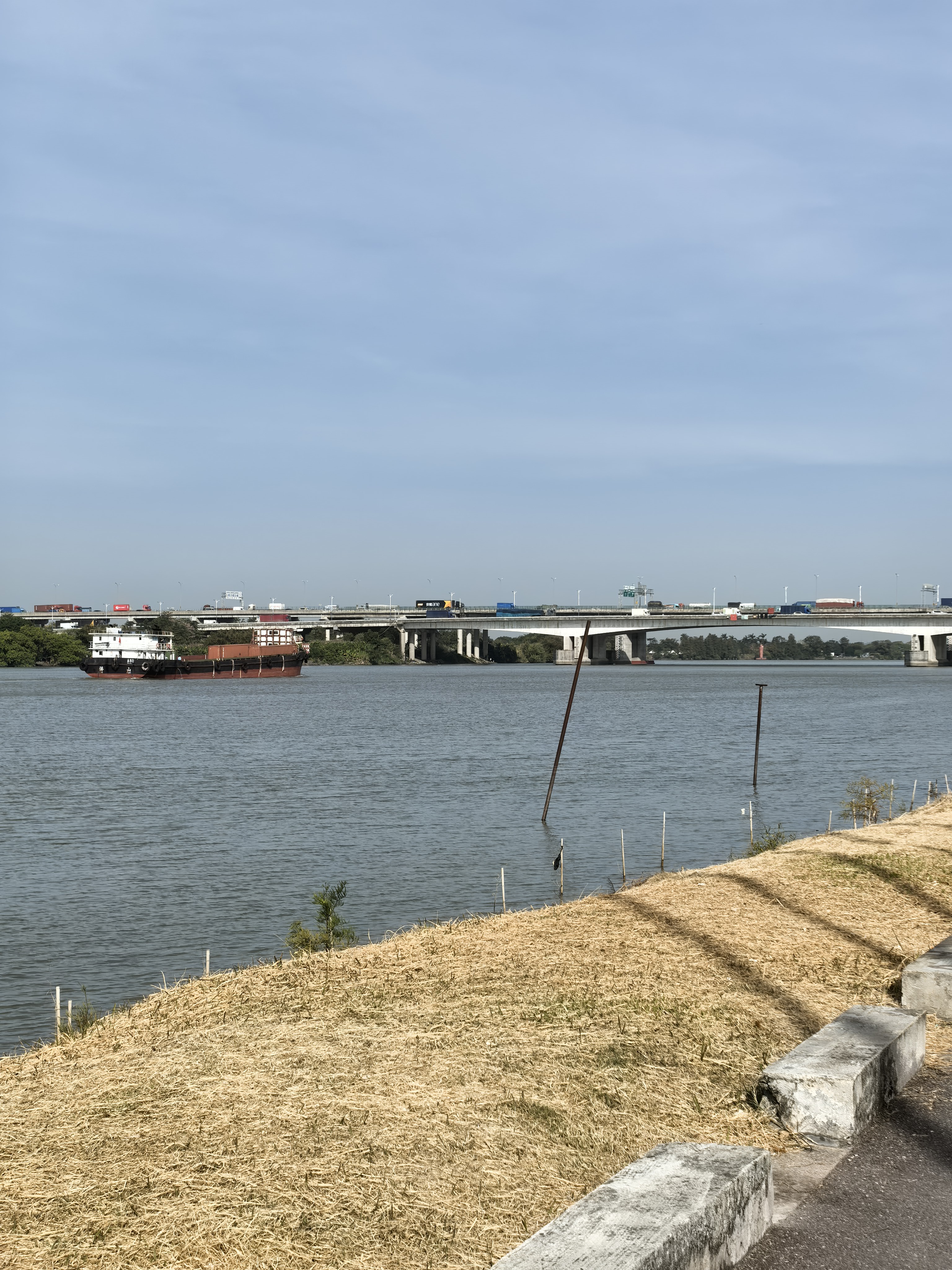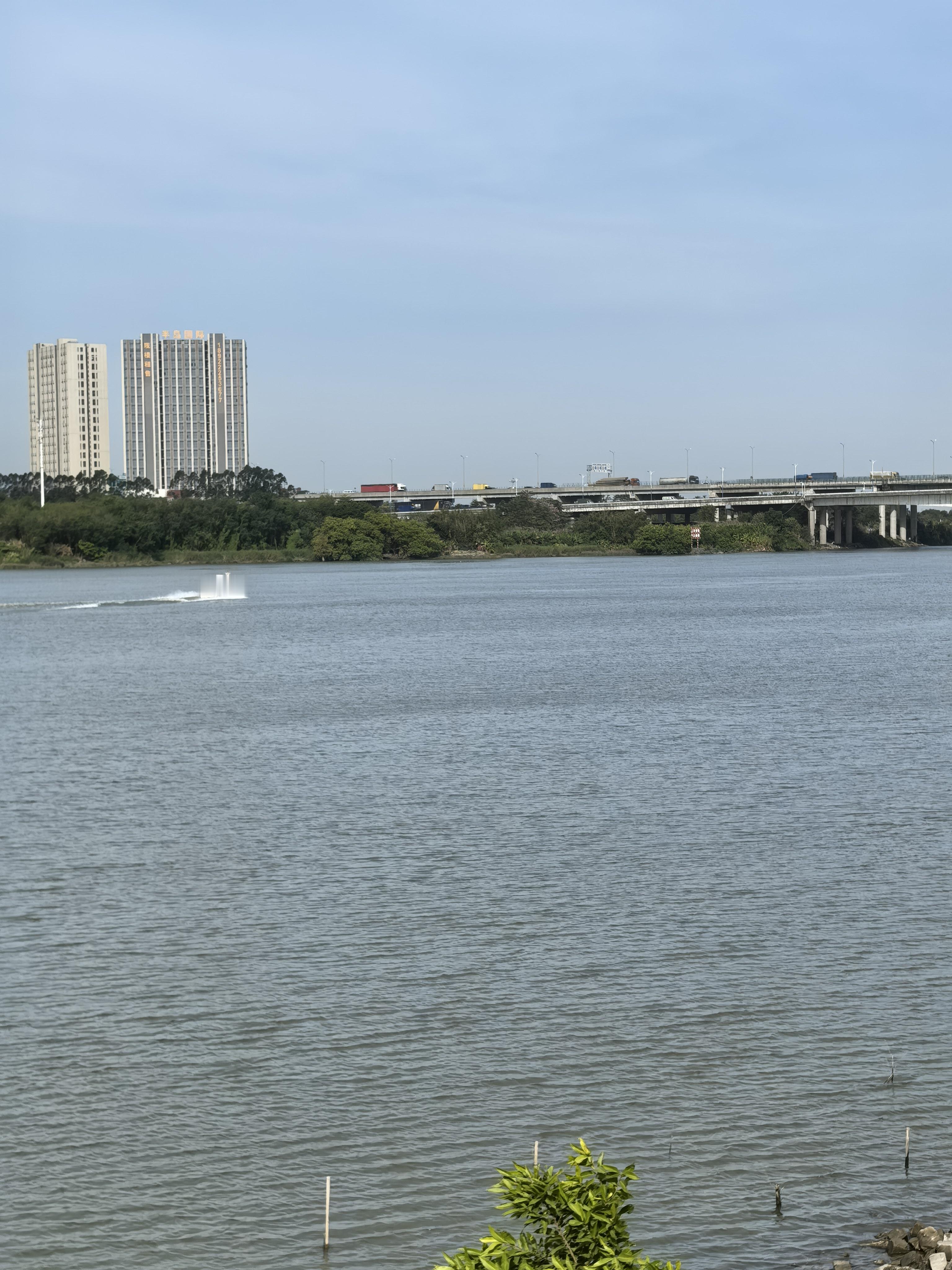江上的快艇、货船穿梭在水面上,远处高架桥的车流、城市轮廓淡淡地隐没在雾里,江水退了些,露出石阶上浅浅的水痕。偶尔有跑步的人经过,脚步声清脆地响着,很快又远去。