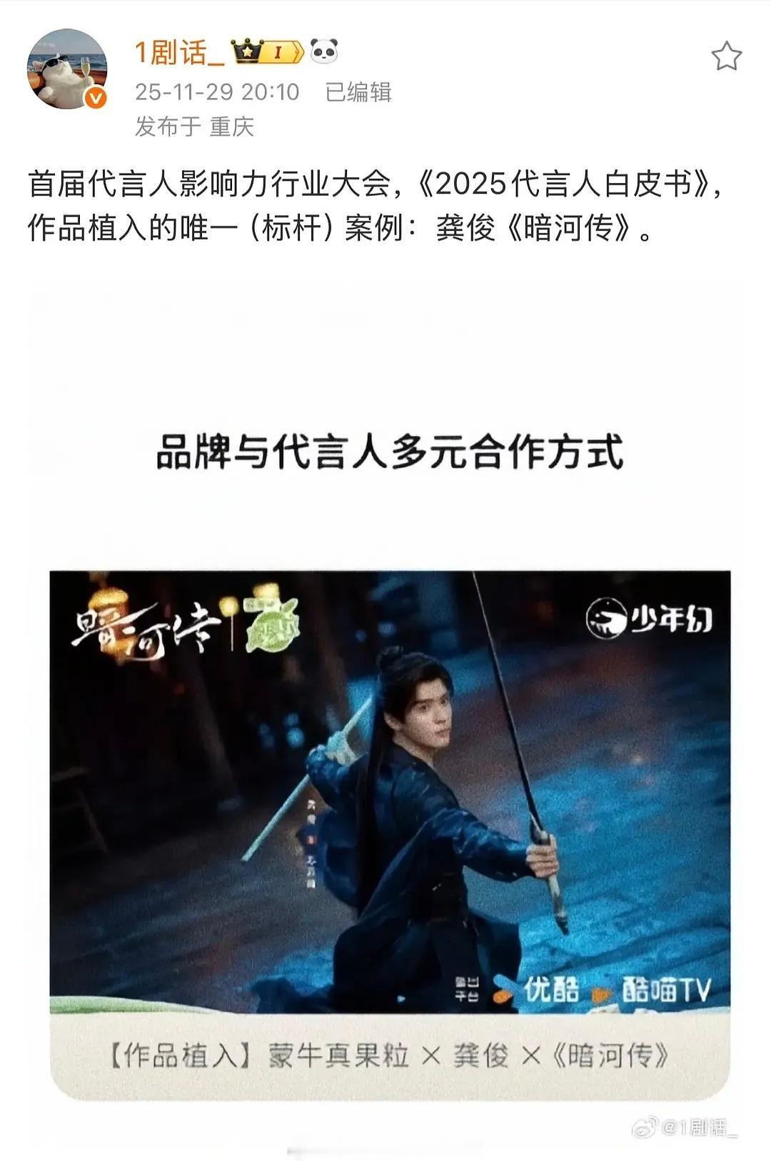 首届代言人影响力行业大会《2025代言人白皮书》认证龚俊《暗河传》➕真果粒=作品植入的唯一(标杆)案例🎉