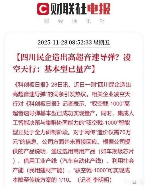 高超导弹洗地不是梦…中国民企凌空天行推出的“驭空戟-1000”高超声速导弹,靠改性建筑水泥当核心材料,硬是把单价压到100万以内(网传约70万弹体成本),让高超武器进入“白菜价”,“导弹洗地”从幻想变成实打实的战术可能! 这款导弹的成本奇迹,全靠“水泥黑科技”撑场:放弃传统高超导弹昂贵的碳/碳复合材料防热层,转而给普通建筑水泥加微陶瓷粉改性,做成发泡形态——内部封闭气孔既能阻断1000℃气动加热,适配5-7马赫飞行,还能吸收雷达波,连隐身涂层都省了,刷层大白就能用。这材料成本是航天级防热材料的几十分之一,单这一项就砍去大半成本! 细节上更是把“省钱术”玩到极致:90%零部件用工业级替代航天级,车规级电缆换航天电缆、淘宝摄像头替专用设备,甚至把0.3元的工业螺丝钉换掉5元的航天螺丝,单枚直接省7万多。再加上新能源汽车同款一体化压铸工艺,批量生产时结构件成本才3200元,低成本量产完全无压力。 实力却没因低价打折:1300公里射程、10分钟精准打击,“打水漂”机动让防空系统形同虚设,专克海上移动目标。对比美国“暗鹰”导弹1亿美元单价,咱们40枚才抵得上人家1枚,性价比直接拉满!