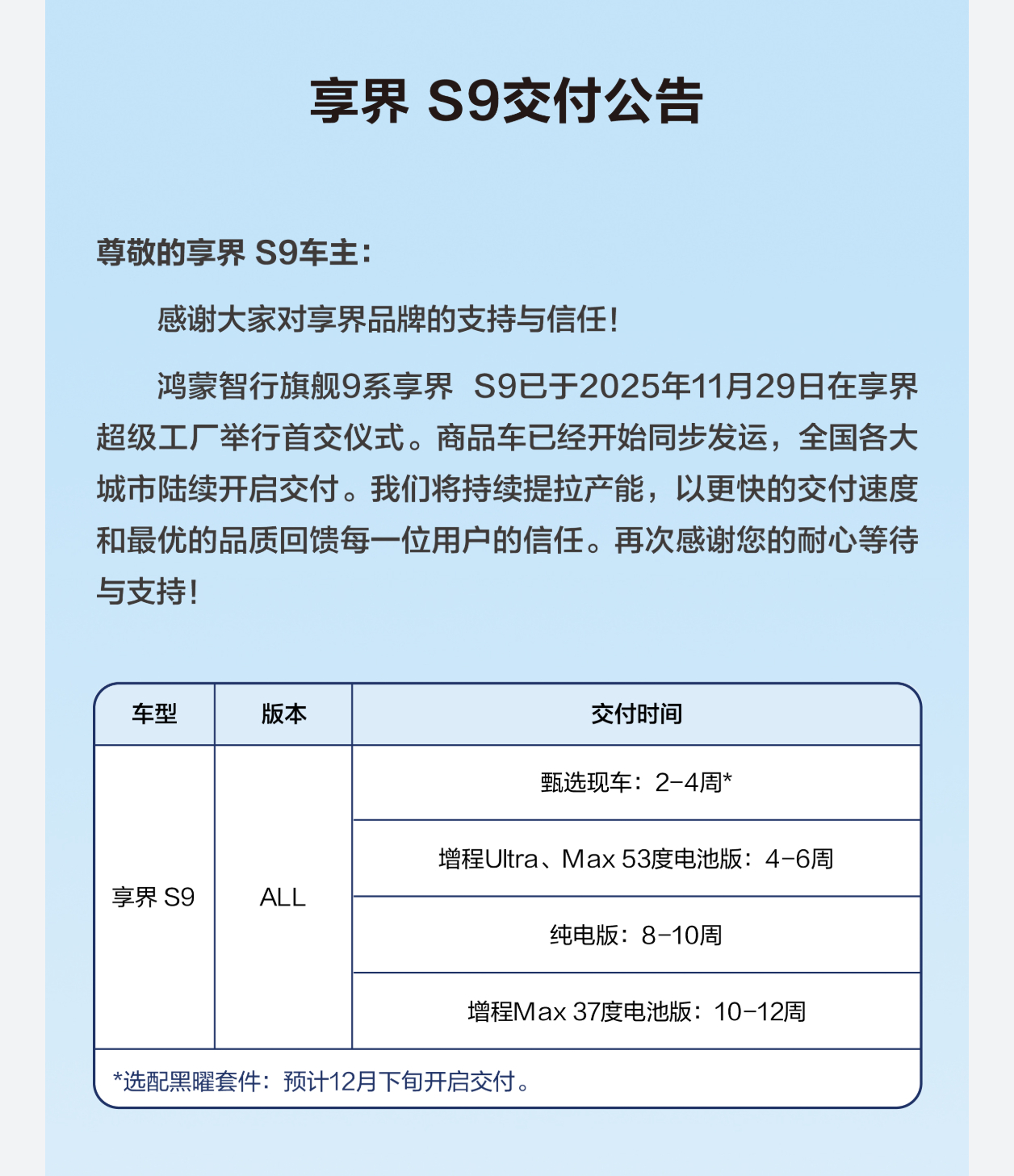 新款享界S9甄选现车交付周期2-4周,增程Ultra、Max53度电池版交付周期4-6周,纯电版8-10周,增程Max37度电池版10-12周。纯电版交付是慢,但其他品牌的纯电车交付也慢,新款S9绝对是值得等待的