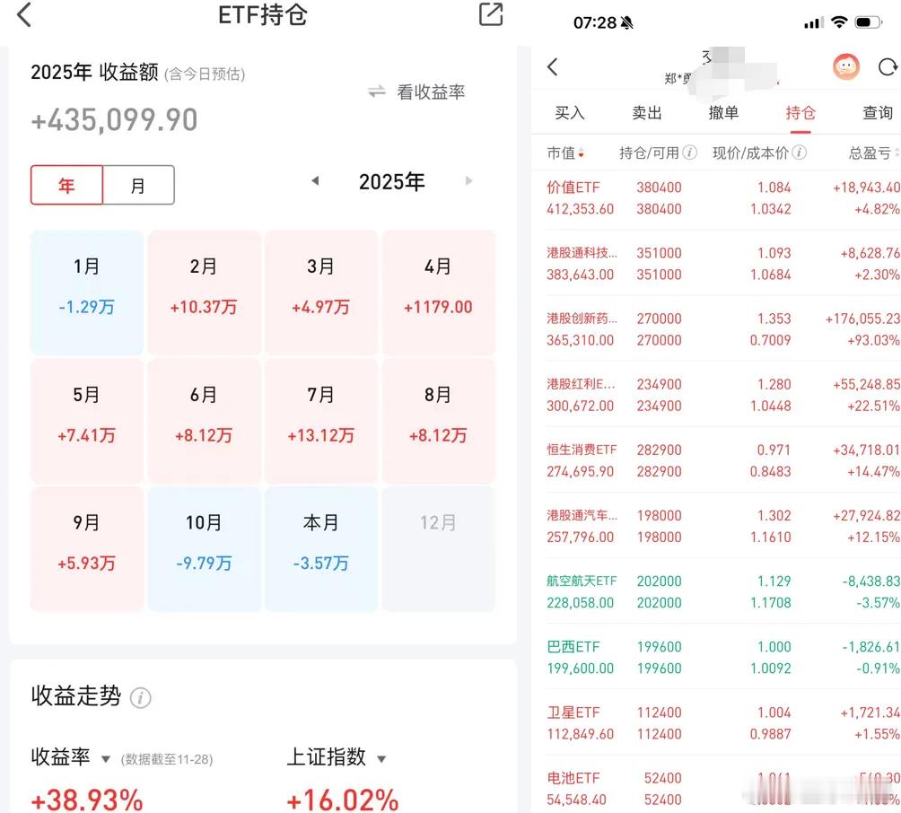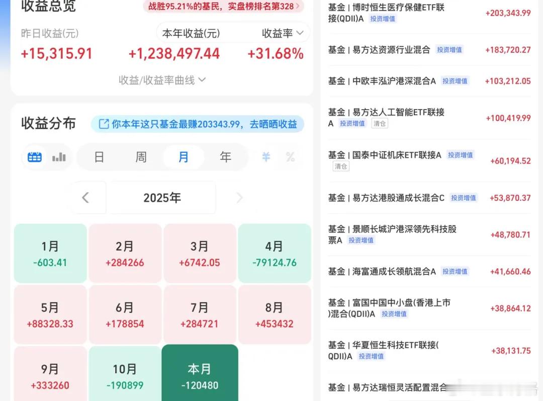 讲真!年底市场还能大涨吗?博格目前主要有三个账户:场内ETF账户资产260万元;场外基金账户资产550万元;投顾组合持仓资产110万元,合计持仓超1000万元了。有人问这钱都是投资赚的吗?讲真,一半是打工赚的,一半是投资赚的。(一)场内ETF账户这个账户还是非常厉害的、除了1月份亏损1.29万,之后的2-9月连续八个月赚钱。谁能想到10-11月连亏两个月,累计亏损13万多,直接把8-9月两个月盈利给对冲了。今年以来账户累计收益43.5万,由于近两个月又转了70万资金进去,把今年收益拉低到了38.93%。目前主要持仓为价值ETF、港股通科技ETF、港股创新药ETF、港股红利ETF等,以港股配置为主。(二)场外基金账户这个账户配置的比较分散,年初除了1月与4月亏损之外,2-3月与5-9月七个月盈利。10-11月累计亏损31万,也就勉强把9月份33万盈利给对冲了,算是比较抗跌了。今年以来账户累计盈利123.8万,收益率为31.68%,大幅跑赢了市场了。(三)年底市场还能大涨吗?咱们小结一下:两个账户今年以来累计盈利167万,这还是在9-10月份回撤70万之后的结果,博格梦想就是年底之前账户盈利可以创新高。接下来聊聊:年底市场还能大涨吗?(1)资金的角度ETF份额变化是每日都要披露的,咱们可以从真实的ETF资金流向管中窥豹。图片股票型ETF(主要投资A股)资金流向:上周市场大幅回调的时候,有超过500亿的资金净流入;这周市场企稳回升的时候,有超过500亿的资金净流出。这就有点尴尬了,大户们都玩起高抛低吸了,A股想要突破4000点的话,需要更多的新增资金了,问题钱从哪里来呢?跨境型ETF(主要投资港股)资金流向:今年以来南向资金累计流入港股近1.4万亿港币了,你没有看错,不是1400亿,而是14000亿。“有买就有卖”,南向资金持续买入,大概率是外资持续卖出了,在这样大背景下港股想要大涨也不容易。现在唯一能期待的就是,明年初保费开门红,保险公司拿到资金之后,继续加仓港股红利。(2)估值的角度中证全指市盈率为20.98倍,这个估值水平跟2021年高点差不多了。估值水平处于最近十年91.18%。有人一定会说,最近十年没啥像样的牛市,所以显得现在估值比较高。博格只能找来,中证全指近二十年的市盈率曲线:20.98倍市盈率处于最近二十年77.18%水平,也不算低了。未来唯有靠企业盈利增加拉低估值。从资金面与估值面看,年底市场大概率没啥行情了。(四)本周操作在上周市场回调的时候,博格私域持续发车:减仓10万价值ETF加仓20万巴西ETF、5万港股通科技ETF,5万电池ETF加仓2万医药汉堡,加仓1万红利汉堡。本周没有操作。之前文章中提到:“明年初保费开门红,保险公司拿到资金之后,大概率会继续加仓港股红利”。若下周红利回调的话,博格会发车一些红利汉堡。本期周报就到这里,大家点赞支持。基金a股股市