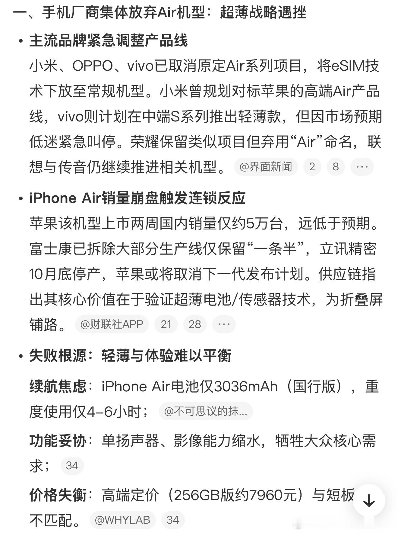 iPhone Air这个产品线本身就没有冲着“爆款”方向去走,用的技术路线也是在给苹果折叠屏铺路,身边不少朋友都希望保留这个系列,不要一代就没了,隔一年更新一次就可以了。