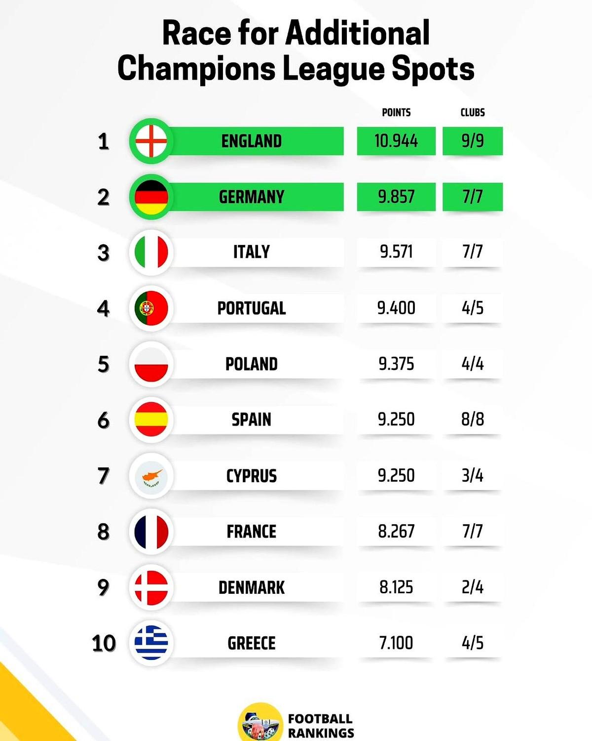欧战积分排名又炸锅了!西班牙居然跌到第六?西超这是咋了? 英格兰还是稳稳第一,德国第二但意大利追得越来越近,感觉随时能反超;葡萄牙悄悄升到第四,波兰也冲到第五——这俩是真能打! 西班牙这次直接掉第六,法国升第八,希腊还进了前十!要知道以前西班牙可是欧战老大啊,现在这表现有点拉胯,再这样下去额外欧冠名额会不会受影响? 意大利和葡萄牙倒是越来越猛,看来欧足联这积分战,真不是闹着玩的!网友都在说:老牌强队也得卷起来了!