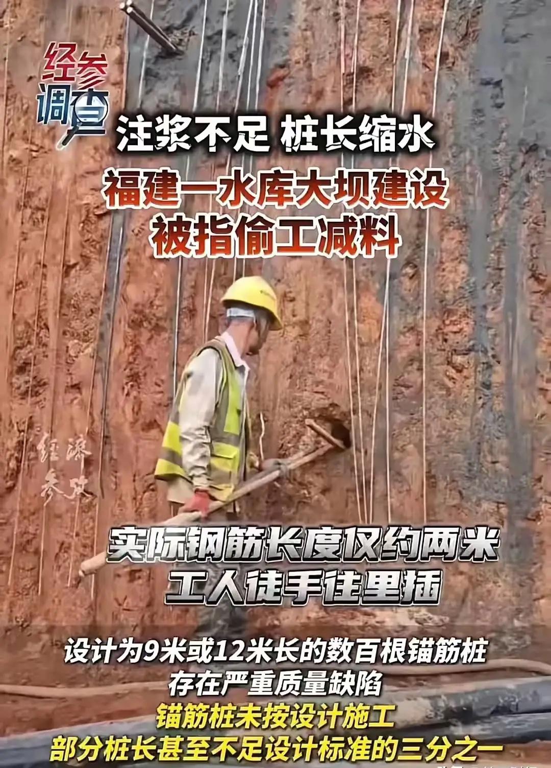 还有基本的生命重于泰山观念吗? 福建永安抽水蓄电站工程,记者王文志把这个马蜂窝捅了。看看吧: 本来要求深入地下12米深的桩,只有2-3米。偷工减料,基本废了。 本来要求一根桩4袋水泥,结果一袋水泥灌10几个桩,因为深度浅了,当然水泥自然节约了。浓度不够,质量差,硬度差。经不起水冲刷。 这可不是什么小工程的小纰漏,而是国家“十四五”重点能源项目,总投资足足75亿,装机容量1200兆瓦,承担着区域电网调峰填谷和防洪安全的重任,大坝设计标准更是要扛住200年一遇的洪水。可就是这样关乎万千人生死的核心工程,竟被施工方当成了牟取暴利的工具,那些本该扎根地下12米、牢牢锁住坝体的锚筋桩,成了最短不足2米的“矮子桩”,本该每根用4袋水泥筑牢的根基,硬是被1袋水泥分摊给十几个桩孔,最后不过是几根钢筋简单点焊,抹点砂浆应付了事,简直是拿下游百姓的性命当赌注。 负责施工的中国水利水电第三工程局,压根没把质量安全放在眼里,眼里只有缩减成本的算计。按设计标准,600多根锚筋桩仅水泥和钢筋成本就得1200多万,可偷工减料后成本不足300万,中间近千万的差价全被相关方私吞。更离谱的是,除了桩深和水泥用量缩水,大量锚筋桩连核心的注浆管都省了,钢筋焊接也是敷衍了事,有的甚至只插单根钢筋,用锤头一敲就松动移位,这样的“残次品”根本起不到加固作用,清华大学专家直言,这会让大坝边坡抗滑移能力下降30%-50%,一旦遭遇极端天气,大坝整体失稳、决堤的风险会呈指数级上升。 更让人愤怒的是,问题早有征兆却没人管。今年8月,电站另一标段的边坡就因为同样的锚筋桩质量问题发生大面积垮塌,可涉事方非但不整改,反倒变本加厉继续违规施工,已完成的600多根锚筋桩里,符合设计要求的可能还不到30%。本该守住质量防线的监理方,更是彻底失守,浙江华东工程咨询有限公司的监理人员,收了施工方的好处,频繁接受宴请,甚至跑到KTV喝花酒、找异性有偿陪侍,拿着监管薪资却干着通同作弊的事,本该逐根核查签字的隐蔽工程,成了走过场的形式,硬生生把安全防线撕开了大口子。 更讽刺的是,这个项目的设计方、施工方和监理方,居然都同属中国电建体系,监理单位还是设计单位的全资子公司,这种天然的隶属关系,让监理本该有的独立性荡然无存,也为利益勾结埋下了隐患。明明建筑法明确规定,监理单位不能和施工方有隶属或利害关系,可他们偏偏无视法规,形成了“自己监督自己”的荒唐局面,也难怪偷工减料的胆子越来越大,连基本的施工规范都抛到了脑后。 面对记者曝光的铁证,施工方还在狡辩,说桩体没装注浆管是因为七八月份做了设计变更,可翻遍当时的现场备忘录,压根没有任何变更记录,设计单位更是直接否认,所谓的变更连批准手续都没有,纯粹是掩盖问题的借口,编得漏洞百出却还想蒙混过关。他们大概忘了,这不是赚快钱的小生意,每一根锚筋桩都连着下游村庄的房屋农田,每一次偷工减料都系着无数家庭的安危,8月的边坡垮塌已经敲响警钟,可他们依旧漠视风险,这种对生命的冷漠比偷工减料本身更让人不齿。 好在事件曝光后,官方已经紧急介入,永安市水利局和中国电建都成立了专项调查组进驻现场,暂停了相关作业,涉事方不仅可能面临1.5亿到3亿的高额罚款,还得承担全部返工费用,要是核查后确认造成重大损失,相关责任人还可能触犯工程重大安全事故罪,最高能判十年有期徒刑。可公众要的不只是罚款和判刑,更要查清背后是否存在深层利益输送,要把所有不合格的桩体彻底整改,要完善监管机制,杜绝“自己监督自己”的漏洞,让每个环节都真正把生命安全放在首位。 水利工程是民生工程,更是良心工程,一丝一毫的偷工减料,都是在透支信任、漠视生命。希望这次的严查能一查到底,给下游百姓一个交代,给所有工程从业者敲醒警钟,生命重于泰山从来不是一句口号,任何拿生命当赌注的贪婪行径,都必将受到最严厉的惩罚。 各位读者你们怎么看?欢迎在评论区讨论。
