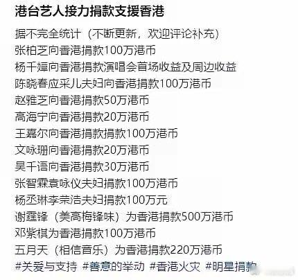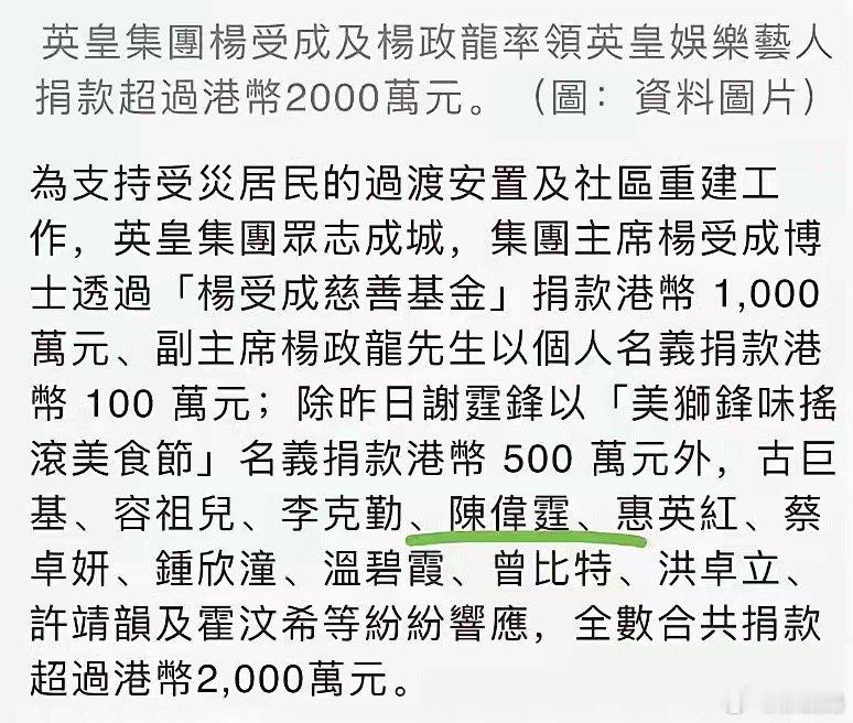 很多网友的猜测应该是对的,陈伟霆与何穗只是官宣生子,并没有领证结婚。这次香港大火捐款,极有可能就是一个小小的证明。一般明星夫妻,如果两位都是圈内人,基本上会合起来捐一份,而且写明某某夫妇,比如张杰和谢娜,张智霖和袁咏仪,李荣浩和杨丞琳,还有陈小春携全家等。而陈伟霆却与英皇其他艺人一起合共捐款,可见有些网友的预感很正确,你们觉得呢?