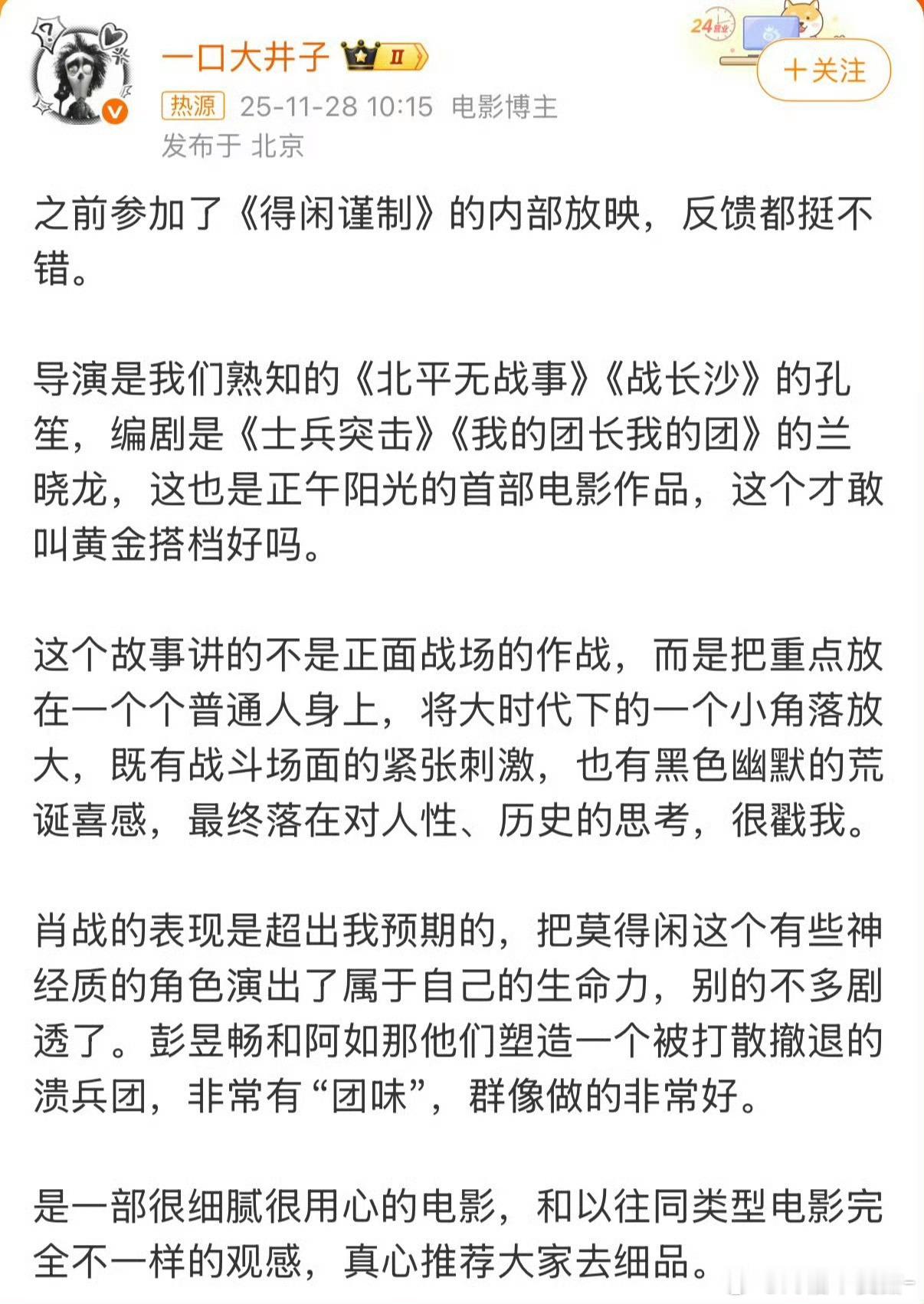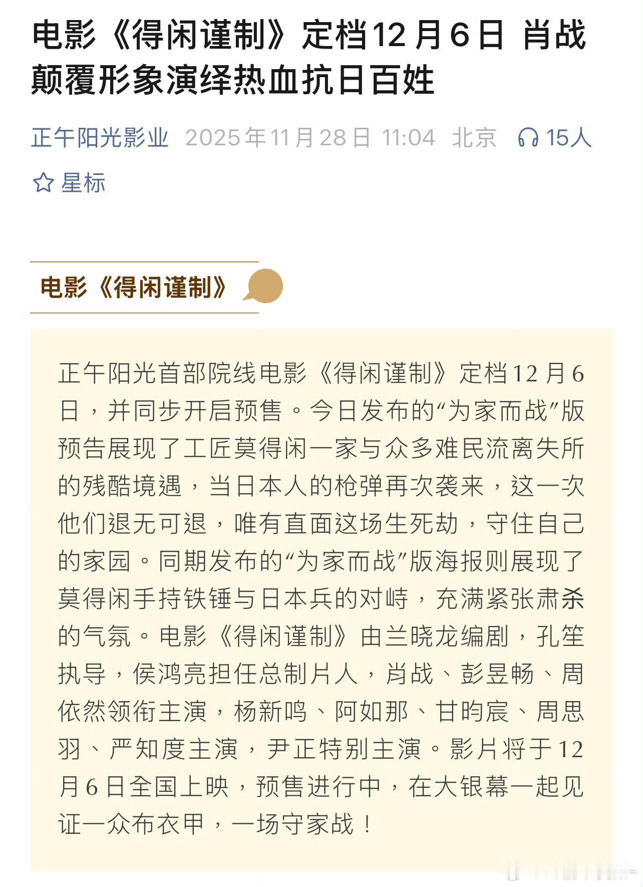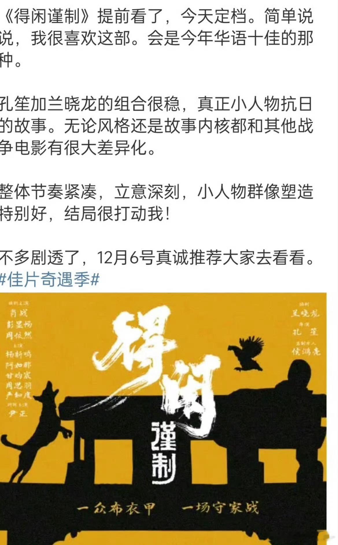 刷到一批业内看完肖战的《得闲谨制》发了看片repo 是非常不错的一部电影 得闲身份多重 是普遍中国人的缩影 太期待了!12.6不见不散得闲谨制把编剧排在主创第一位