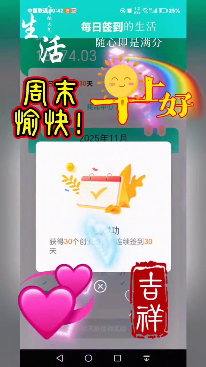 自己的生活随心即是满分。 每日签到的生活:获得30个创业券,已连续签到30天。祝福是人间温暖的语言;问候是心里真诚的挂念;健康快乐是我每天的留言。