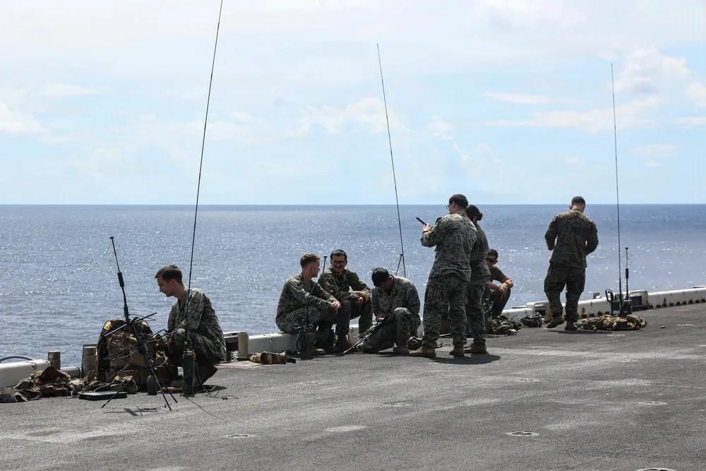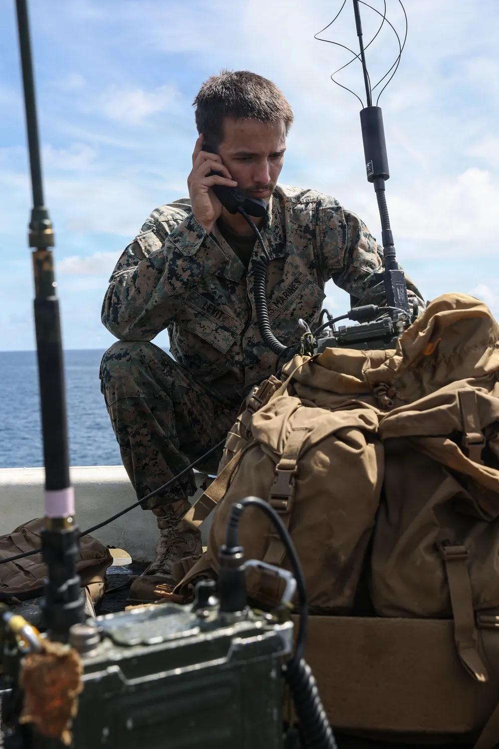美军在委内瑞拉周边海域进行整装待发。 2025年11月16日,加勒比海,第22海军远征部队(特种作战能力)美军陆战队员在加勒比海航行期间,在“黄蜂级”两栖攻击舰“硫磺岛”号(LHD 7)上进行军用加密通信设备检查。美军部队部署到加勒比海,以支持美国南方司令部的任务、国防部下达的行动。