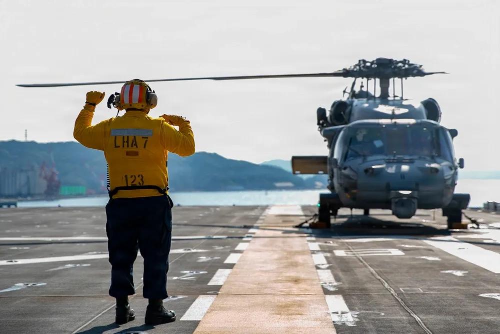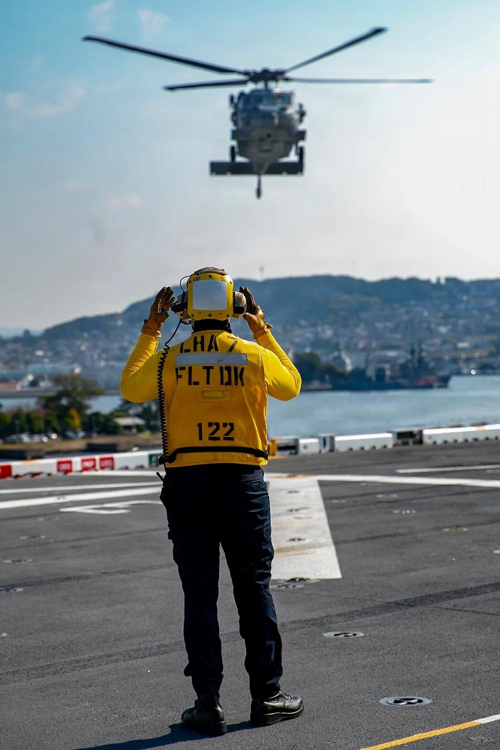 在军舰上起飞降落一架直升飞机不是轻而易举的,美军有一套标准的流程。 2025年11月26日,日本,美军航空水手长(操控)一级海梅·马丁内斯指导一架隶属于第25直升机海上作战中队(HSC 25)的MH-60S海鹰直升机在前沿部署的两栖攻击舰“的里波利号”(USS Tripoli,LHA 7)停泊期间进行飞行(起飞,降落)操作。“的里波利号”前沿部署于日本佐世保,隶属于美国海军第七舰队,这是美国海军最大的前沿部署舰队,常态性与盟友和合作伙伴互动。