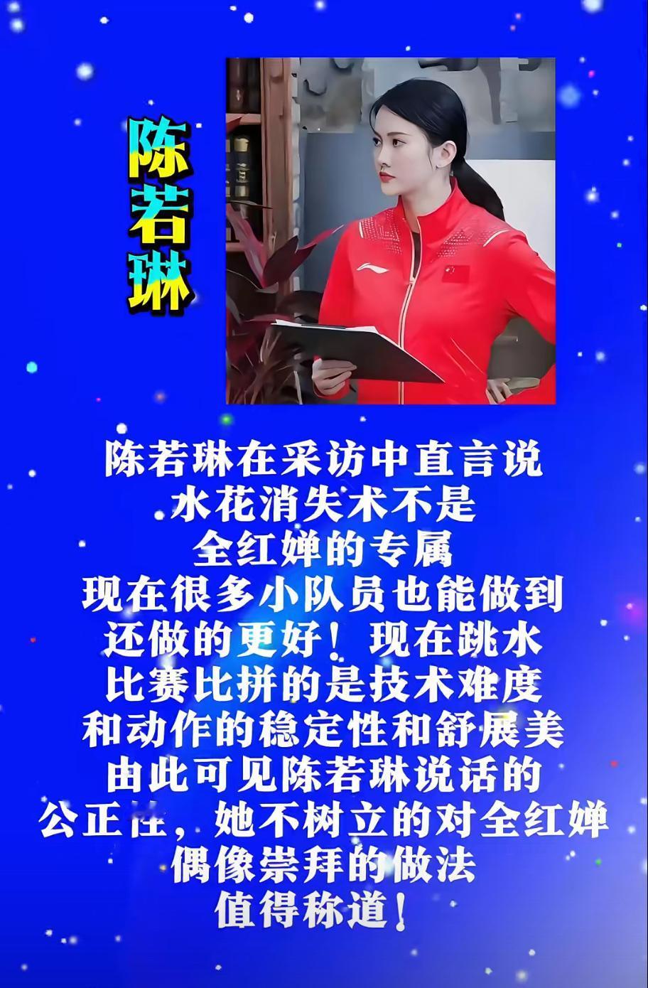 全红婵:从"天才"到"小将" 不神化天赋! 央视重新定义全红婵, 称呼改变,从"天才少女" 改成"跳水小将"。 央视的称谓转变, 恰是对这份专业付出的精准回应, 这一变化更见证着舆论认知的升级。 曾经,大众习惯聚焦于 "水花消失术"的天赋奇迹, 仿佛成了全红婵的"专利"。 其实,陈若琳教练早就直言: "水花消失术"不是全红婵的专属, 现在很多小队员也能做到,还做的 更好!" 由此可见陈若琳说话的公正性, 她不树立对全红婵偶像崇拜的 做法值得称道! 不造神,不迷信, 才是对体育精神的真诚致敬。 如今我们看见的, 不再是神话般的“天赋异禀”, 而是一个真实、专注、 日复一日重复五个动作的运动员。 她依然站在十米台,依然为每一跳全力以赴,只是我们学会了一一 用平常心看拼搏,用尊重代替神化。 有些路,必须一步一步走; 有些名号,终究要让位于成长。 从“天才”到“小将”, 全红婵的下一章,才刚刚开始。