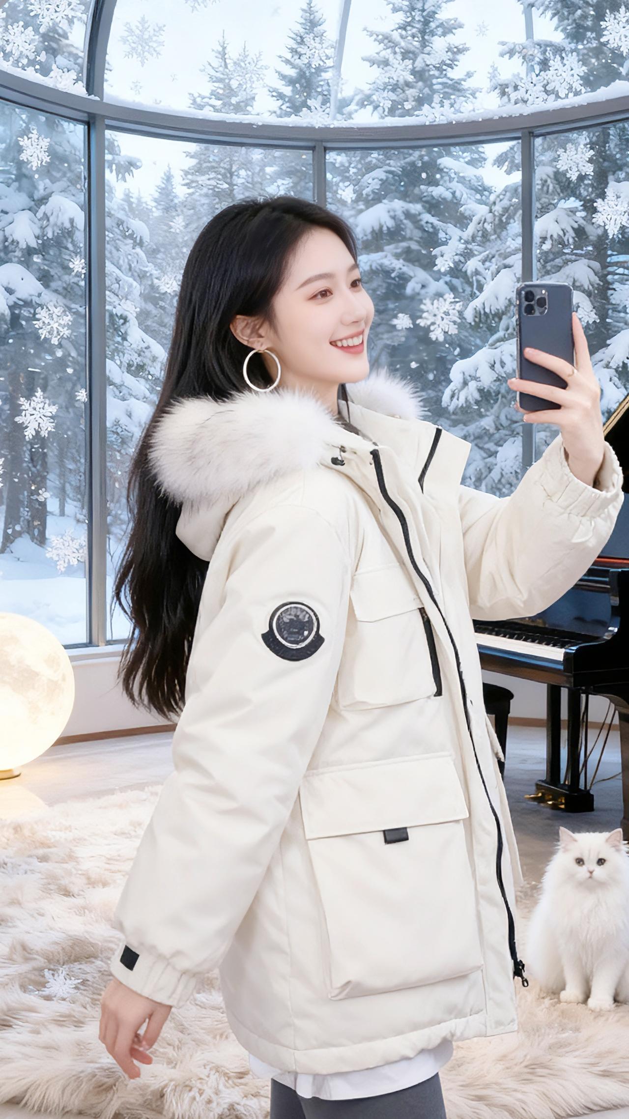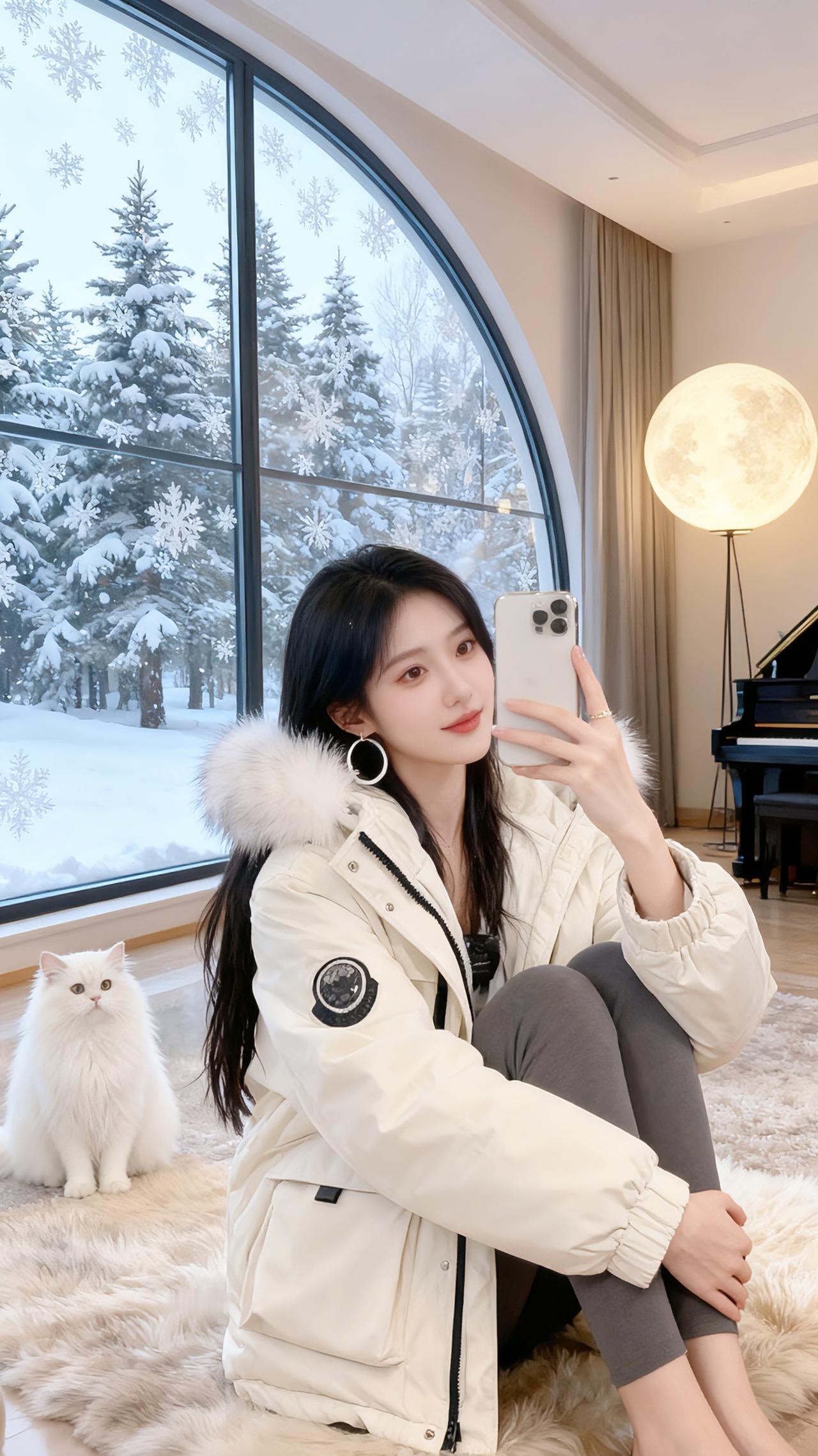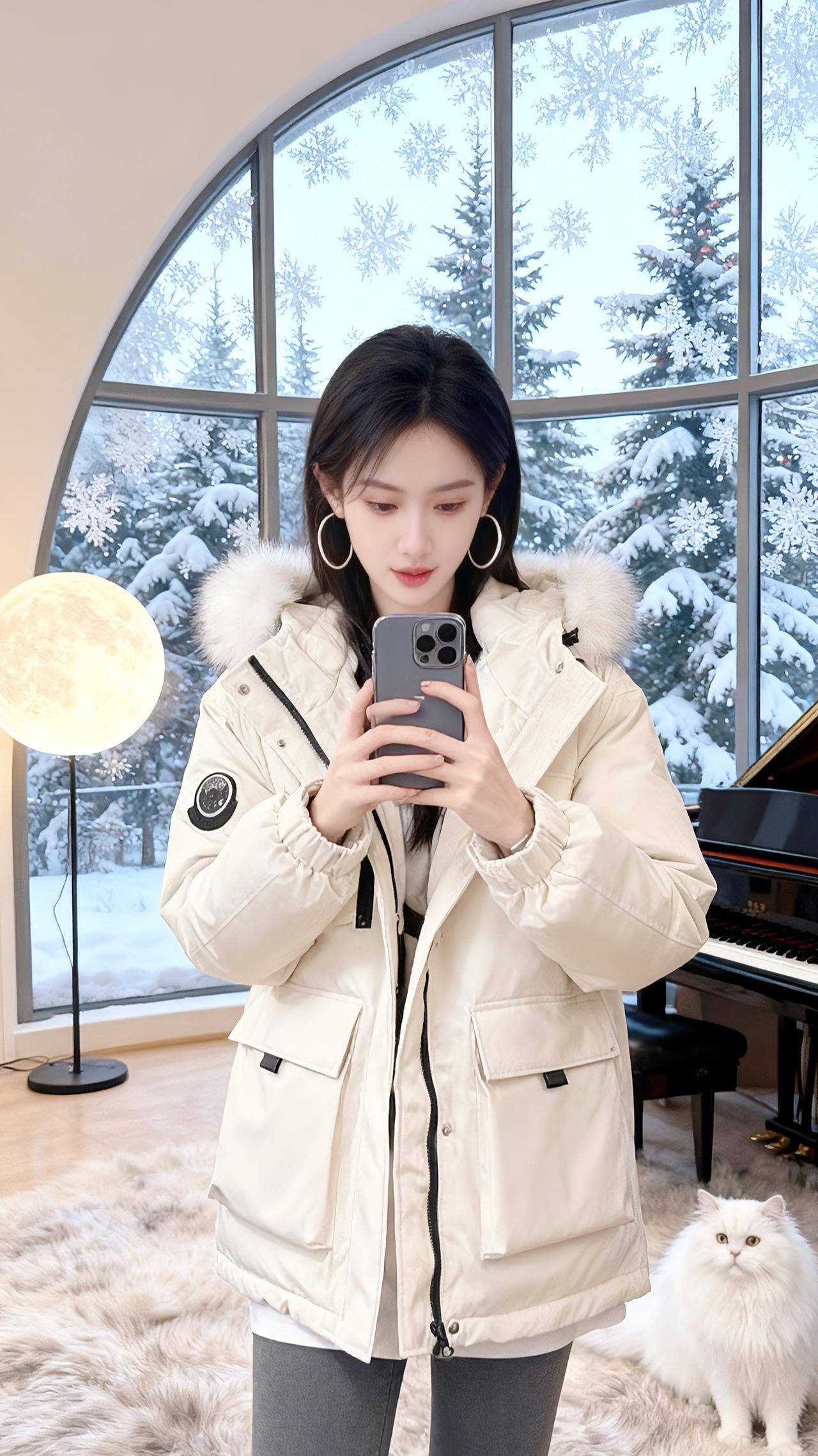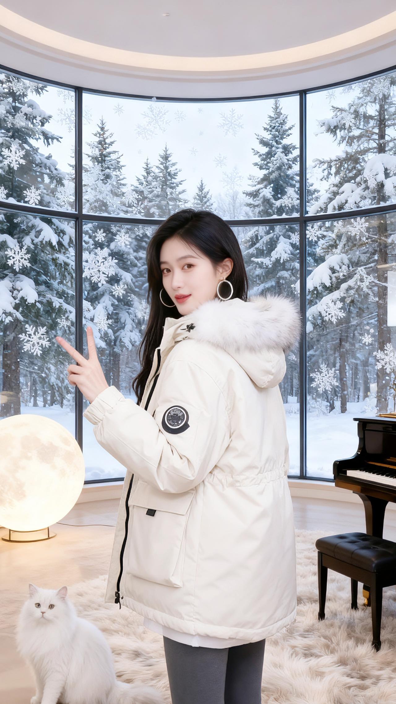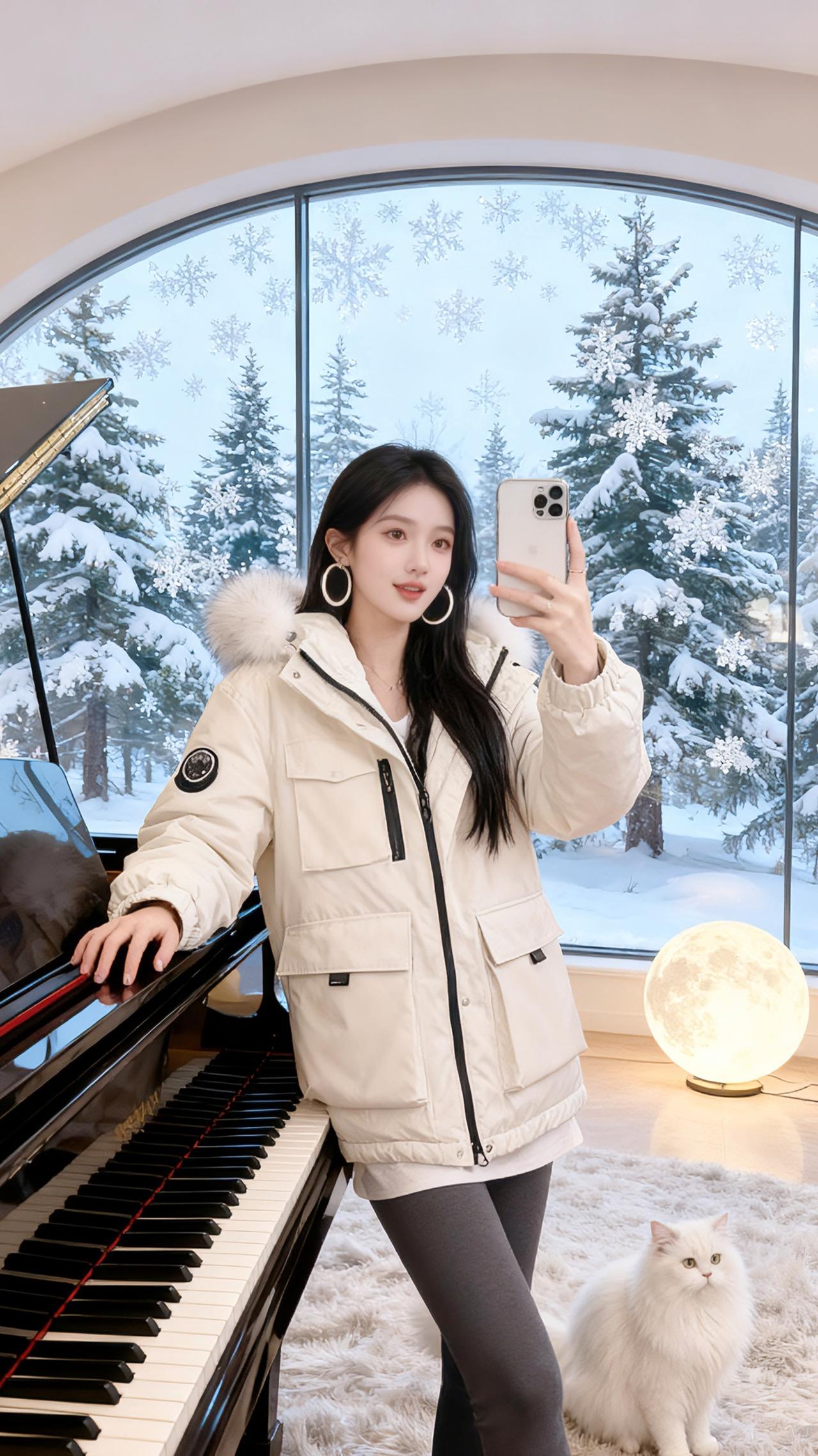 《冬窗里的暖白》 她裹着一身蓬松的暖,像把窗外的雪揉软了披在肩上。米白羽绒服的毛领沾着室内的温,连黑色拉链都浸着软乎乎的光——是冬雪里偷藏的一团云。 落地窗把松枝的白框成画,雪花贴纸浮在玻璃上,像刚落的凉意还没来得及化。她指尖碰着手机屏,耳坠晃成银色的环,连钢琴键的黑都衬得这暖更软。那只白猫蜷在绒毯上,毛与她衣摆的白融成一片,倒像冬自己养的小茸球。 这刻的暖不用讲,是窗里的光裹着她,是羽绒服兜住的热,是连雪都愿意趴在窗外,看她把冬过成了软乎乎的甜。 高级感穿搭 小个子穿搭 外套穿搭 秋冬穿搭