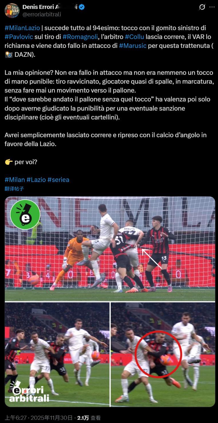 【争议判罚】国外知名裁判博主Denis Errori Arbitrali,解读最后时刻争议。这既不是进攻犯规,也算不上应判罚的手球:近距离射门,球员几乎背对球,处于防守状态,完全没有主动迎球的动作。“如果没有那次触碰,球会飞向哪里” 这个问题,只有在判定是否构成应受纪律处分(即是否该出示牌)的前提下才有意义。我会选择不做判罚,让比赛继续,给拉齐奥一个角球。我非常认同,也是我的观点,总结就是——拉齐奥没有进攻犯规,帕夫也没有手球犯规,角球开始比赛。大圣聊球大圣聊球意甲意甲AC米兰AC米兰