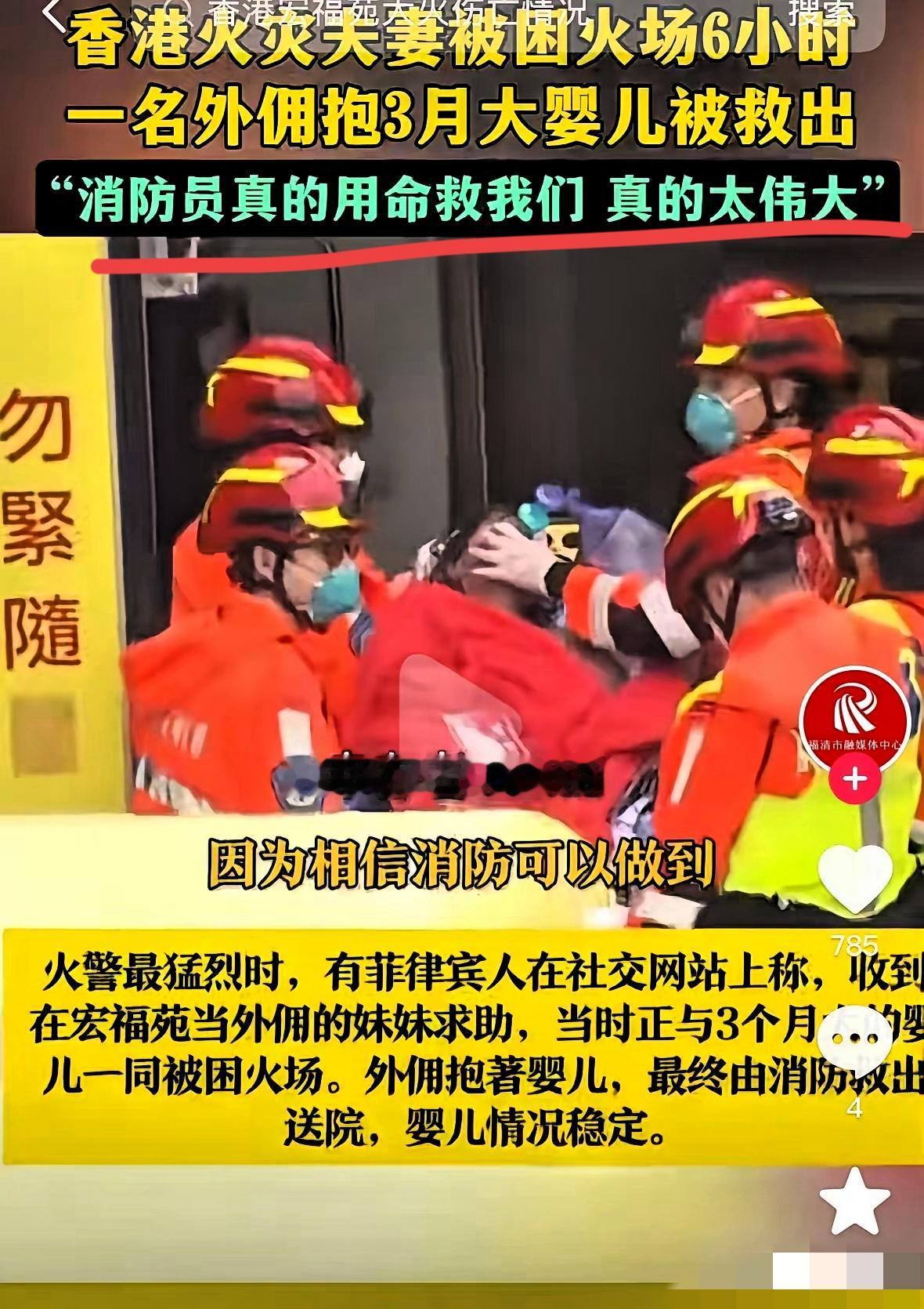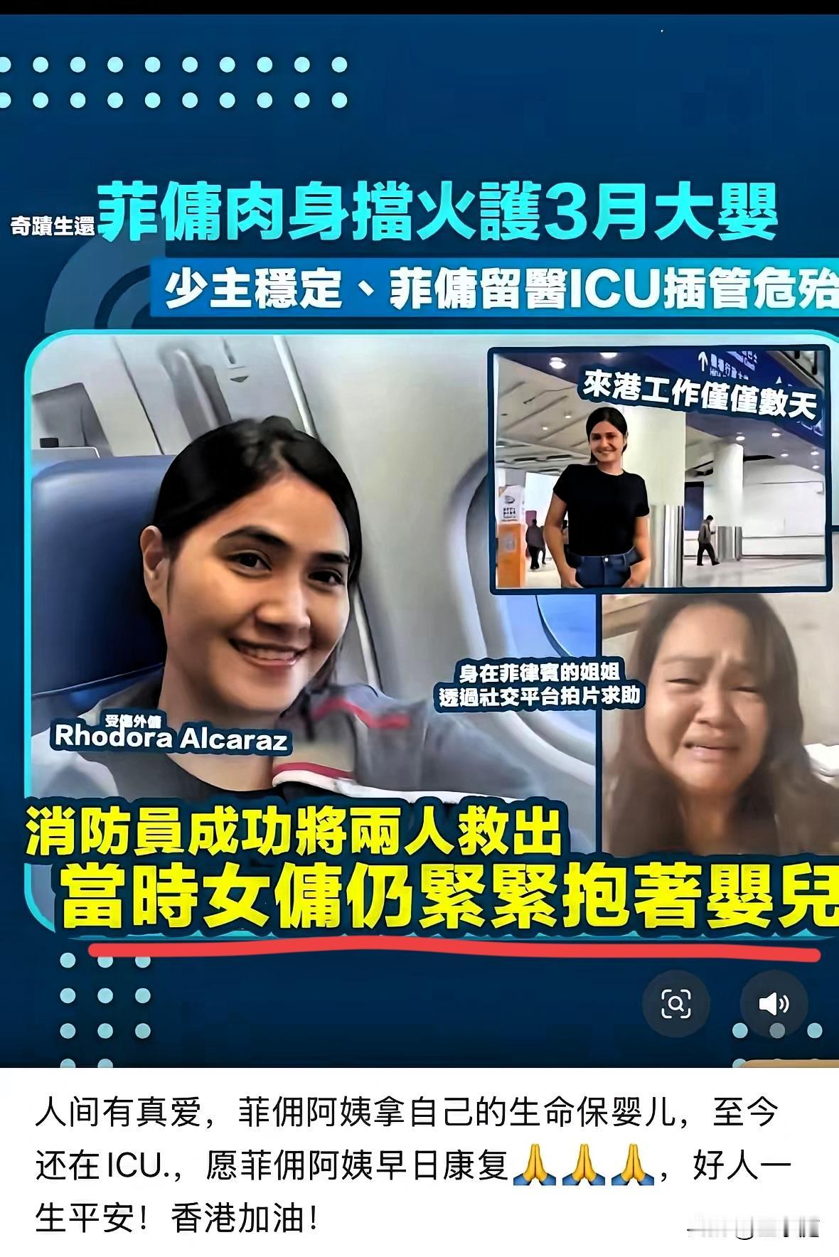 谁不为香港这位菲佣破防?刚到雇主家才几天,火场里竟用命护住了毫无血缘的3个月宝宝! 大火蔓延时,屋里只剩她和婴儿,联系不上雇主的她,一边给菲律宾的姐姐发求救语音,一边死死护住孩子。消防员破门时,看到她蜷缩在墙角,用身体挡着浓烟烈焰,还特意用湿毛巾捂住宝宝口鼻,自己却没做任何防护。 宝宝获救后安然无恙,她却重伤进了ICU插管治疗,情况危急。她背井离乡是为了生计,却在生死关头把生的希望留给了别人的孩子。 真情从无关身份、血缘和报酬,善良是刻在骨子里的选择。那些默默付出的劳动者,用本能的善举,让我们看到人性最暖的光。你愿意为这位勇敢的菲佣祈福,祝她早日康复吗?