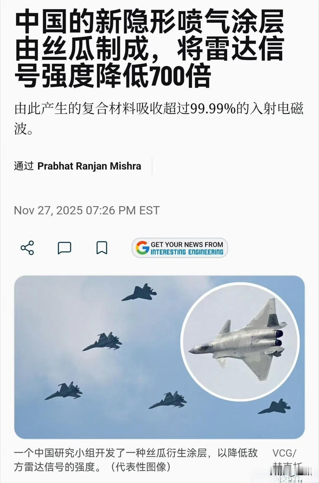 丝瓜变隐身神器,贵州航天计量测试技术研究所与军方联合团队,把干丝瓜经高温碳化变成导电碳骨架,再嵌入镍钴氧化物(NiCo₂O₄)磁性纳米颗粒,一款名为NCO-2的新型隐身材料就此诞生。它在雷达常用的Ku波段吸收率高达99.99%,10000份雷达波仅1份能逃逸,能让50平方米的目标雷达反射截面积缩至不足1平方米,信号强度暴跌700倍,2-3毫米的超薄涂层就能让战机在雷达上“隐身”。丝瓜天然的三维网状结构是电磁波的“迷宫”,碳化后的导电网络+磁性粒子的“磁电双修”,让雷达波进得去、出不来,还绿色低成本,完胜传统昂贵涂层。 从田间丝瓜到国防隐身材料,是中国军工的脑洞背后是实打实的硬实力。网友戏称,那以后洗碗搓澡用啥?