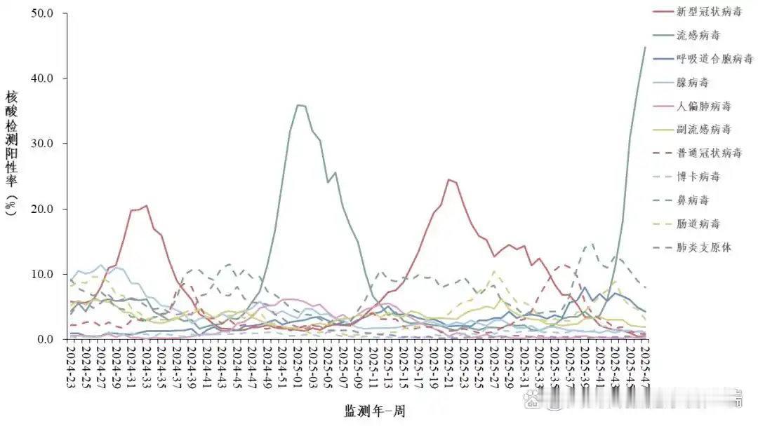 在全国门急诊流感样病例中,流感阳性率接近45%,整体进入中流行水平,部分省份已达高流行水平。 哨点医院门急诊流感样病例呼吸道样本病原体核酸检测阳性率每周变化趋势。