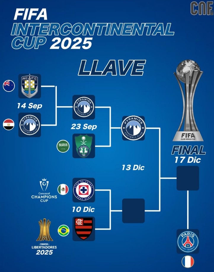 2025年洲际杯赛程随之公布,其中巴黎直接晋级决赛。弗拉门戈将代表南美洲足联出战,对阵墨西哥的蓝十字。两者间的胜者将对阵埃及的金字塔队,最终胜者将在12月17日与巴黎争夺冠军。