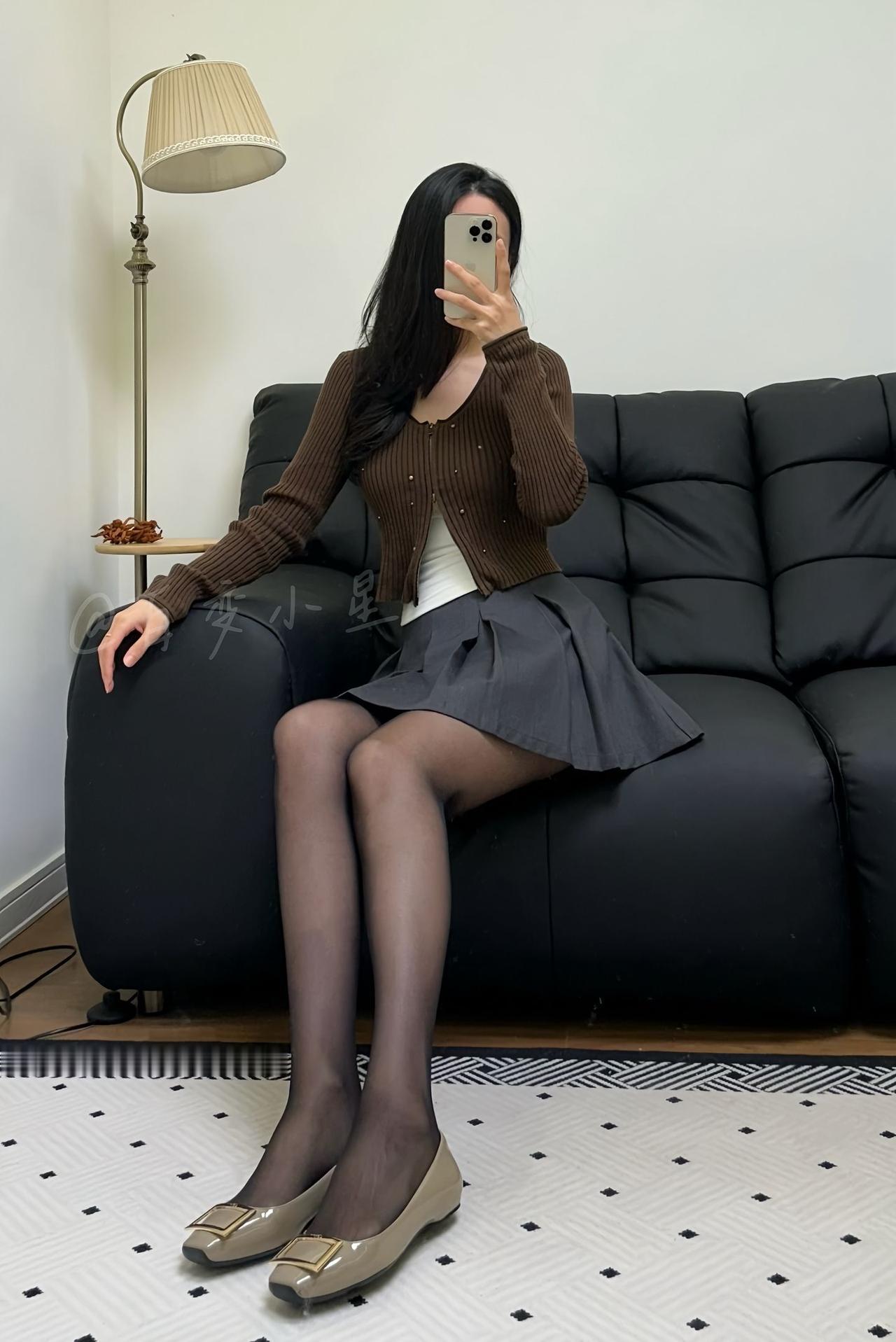 优雅穿搭指南:棕色针织衫+灰色百褶裙,搭配黑色丝袜和米色高跟鞋,尽显知性魅力!