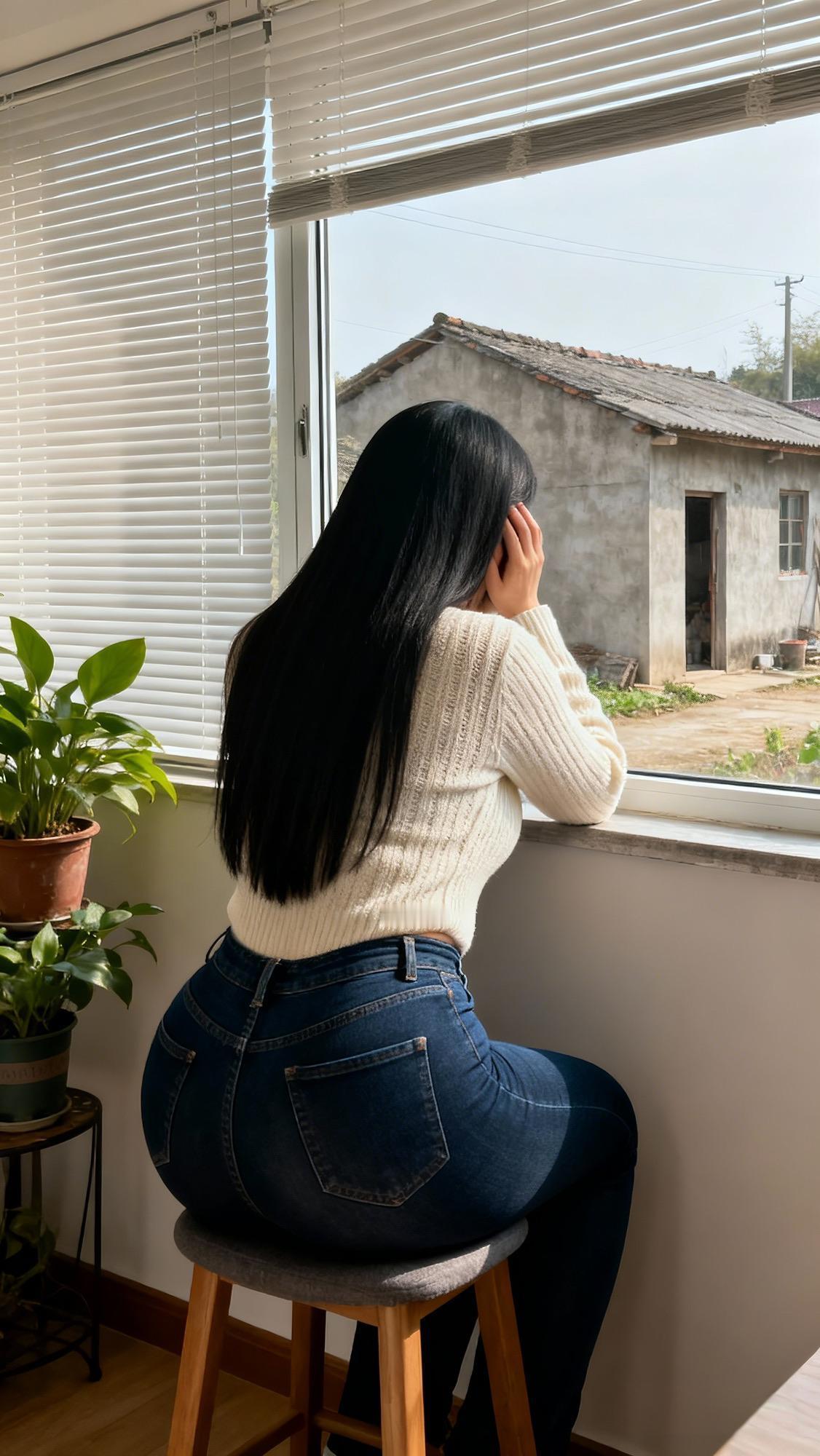 窗棂裁下一方清浅的日光,落在肌理温柔的针织衫上。发丝如墨,垂落肩头,与窗外的旧屋遥遥相望。指尖轻抵耳畔,似在捕捉风穿过老墙的声响,又像沉湎于一段无人知晓的思绪。屋内绿植的新绿,衬着屋外灰瓦土墙的旧意,时光在此慢了下来,唯有目光漫过窗沿,与乡野的静穆相拥,心事似融在这暖阳里,无声,却绵长。农村