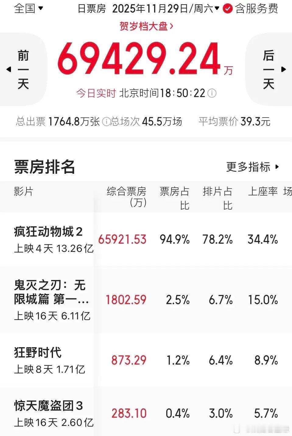疯狂动物城2票房破13亿《疯狂动物城2》已经破13亿票房了。与此同时,《鬼灭之刃》也破了6亿。看样子,《疯狂动物城2》今天的单日票房将轻松破7亿(目前已经6.6亿),冲8亿可能性极大。而大盘也有可能迎来8亿+的票房。