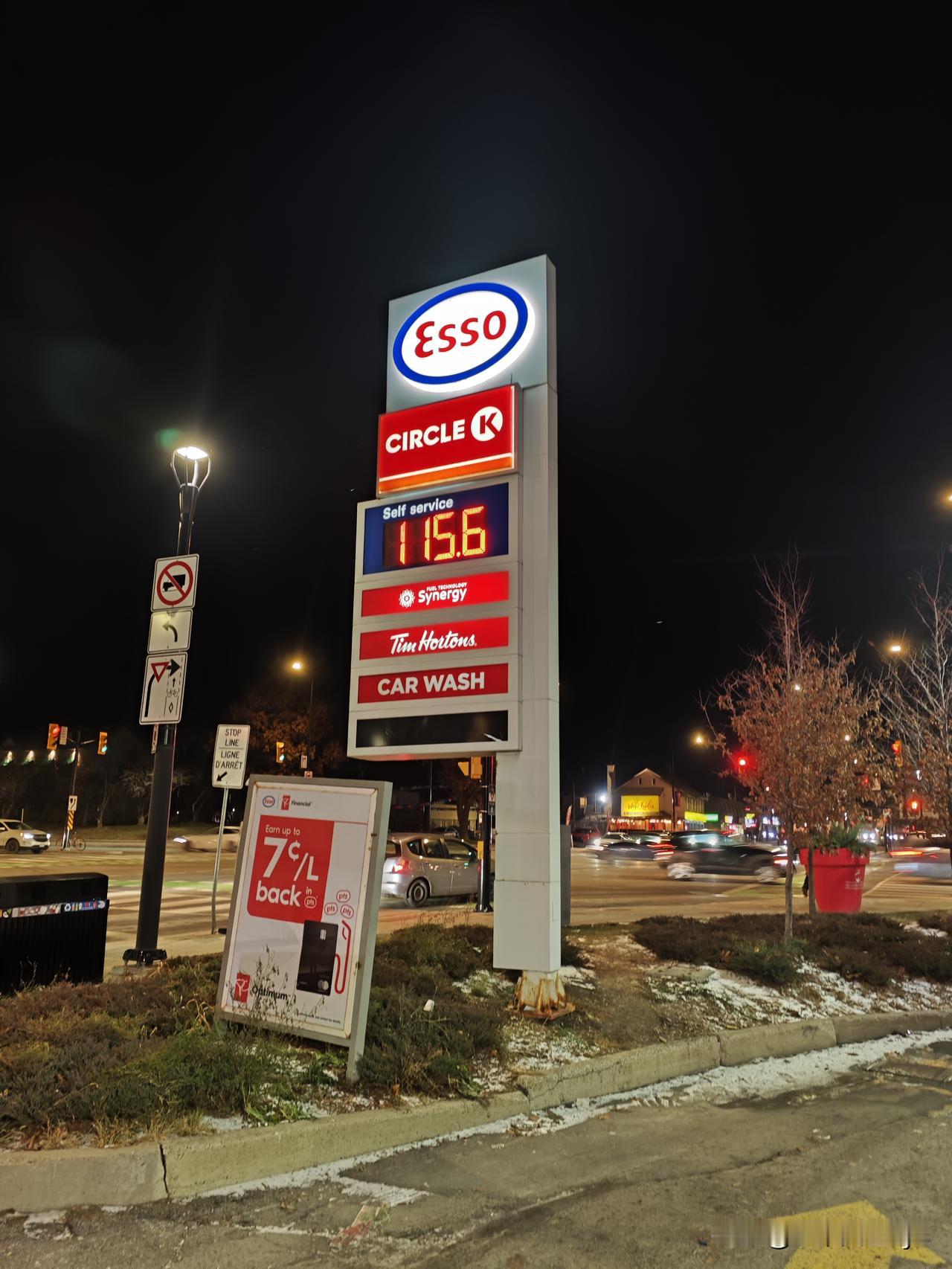 当地时间11月29日晚9点30分,渥太华油价为每百升115.6加元,约合人民币每升5.86元。 早晨的油价还是每升133加元,一天之内油价如此下落,着种情况并不多见。 路过看到,加满了。