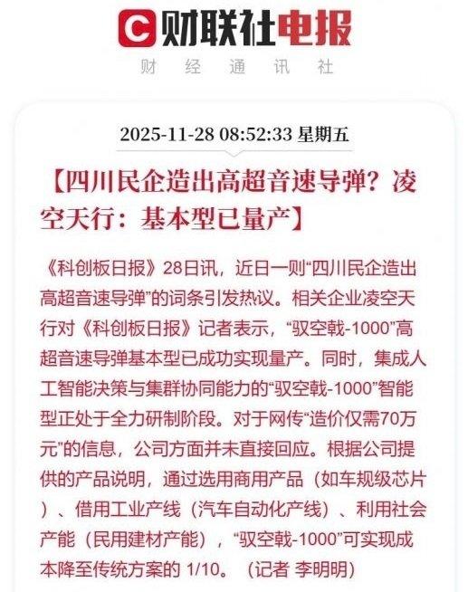 民企乘波体高超音速导弹驭空戟已经量产!这种超高音速高科技精准点穴式武器,一旦不再稀缺,而是饱和式精准攻击,战争模式将再次被改写!该高超弹成本为军企1/10、精度米级、乘波体弹头、500~1300公里射程、5~7马赫!乘波体高超音速导弹在美西方体系内依然停留在实验室阶段!驭空戟导弹意义在于工业强国的特有能力将高超弹“卷至白菜价”,且量大管饱!东大任一点边境(包括海[岛]岸线)1300公里任何一点目标都将纳入驭空戟的“真理”饱和式精准打击范围。 试想这样价廉物美的高超弹被援助到中东、西亚、东欧、南美等等受欺负的地方,结合东大的北斗、无侦,这个世界是否安静许多?