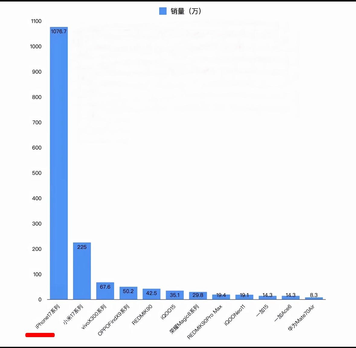 iPhone 17 在中国大陆市场的销量,让我学到了一个新词:“断崖式”领先。 从 2025 年 9 月发售,仅两个月, iPhone 17 在中国大陆市场的累计销量/激活量已突破 1076.7 万台,惊人的数字。 把这个列表中的其他厂家的手机销量全部加起来,iPhone 17 依然是“断崖式”领先。 Money 总是比“情怀”更诚实。