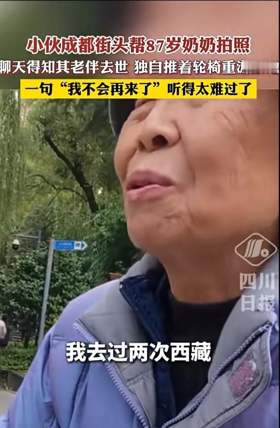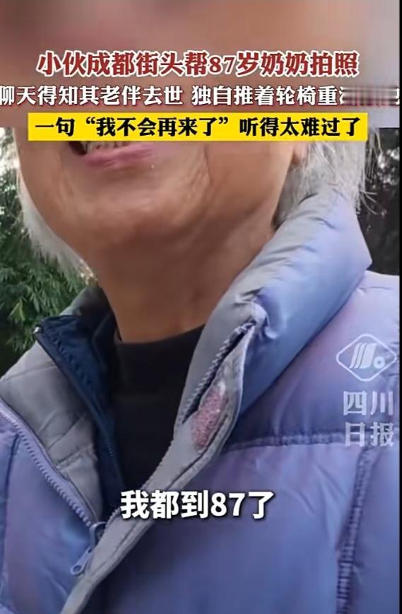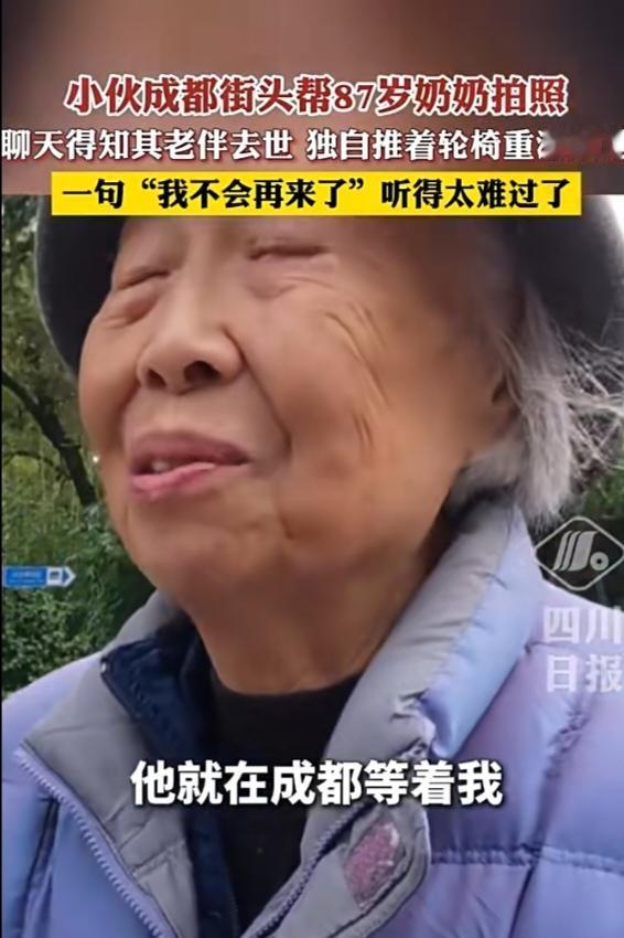 成都街头的空轮椅:87岁奶奶带亡夫重游爱情故地 成都的初冬暖阳里,一条飘着火锅香的老街旁,87岁的郑奶奶推着一辆锃亮的空轮椅,在花坛边驻足。轮椅扶手上搭着顶旧毡帽,边角磨得发软,那是她老伴生前最常戴的样式。她颤巍巍拉住路过的小伙:“后生,能帮我拍张照吗?就站这儿,和以前一样。” 按下快门的瞬间,小伙瞥见老人望着照片轻声呢喃:“你看,还是老样子。”攀谈间才知,奶奶的老伴去年走了,这对相伴六十载的夫妻,年轻时最爱的就是来成都逛吃。当年奶奶两次进藏,血压高的老伴都在这儿等她归来,老街的糖炒栗子、公园的长椅、巷口的茶馆,全是他们的爱情印记。 如今奶奶独自从北京坐绿皮火车赶来,推着这辆曾载过老伴的轮椅,重走所有旧地。她每到一处都要停半晌,摸摸长椅的木纹,凑近闻闻桂花的香气,偶尔回头喊一声老伴的名字,仿佛他还在身后应答。“他等不到的地方,我替他再看一眼。”奶奶说这话时,眼角泛着光,语气却平静得让人心酸。 小伙帮她搬轮椅上出租车时,发现轮椅坐垫被缝补过好几次,那是奶奶亲手补的。“以后不会再来啦,年纪大了。”奶奶笑着挥手,阳光落在她花白的头发上,暖意中藏着不舍。这辆空轮椅载着的,是跨越生死的思念,是老一辈最笨拙也最深情的浪漫。 成都的风轻轻吹过,仿佛在回应这份眷恋。原来最动人的爱情从不是轰轰烈烈的誓言,而是你走后,我带着你的念想,把我们走过的路再走一遍。轮椅老人 轮椅上的老太太
