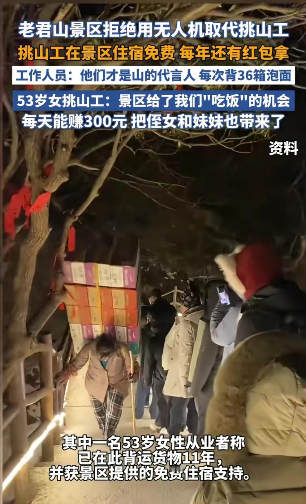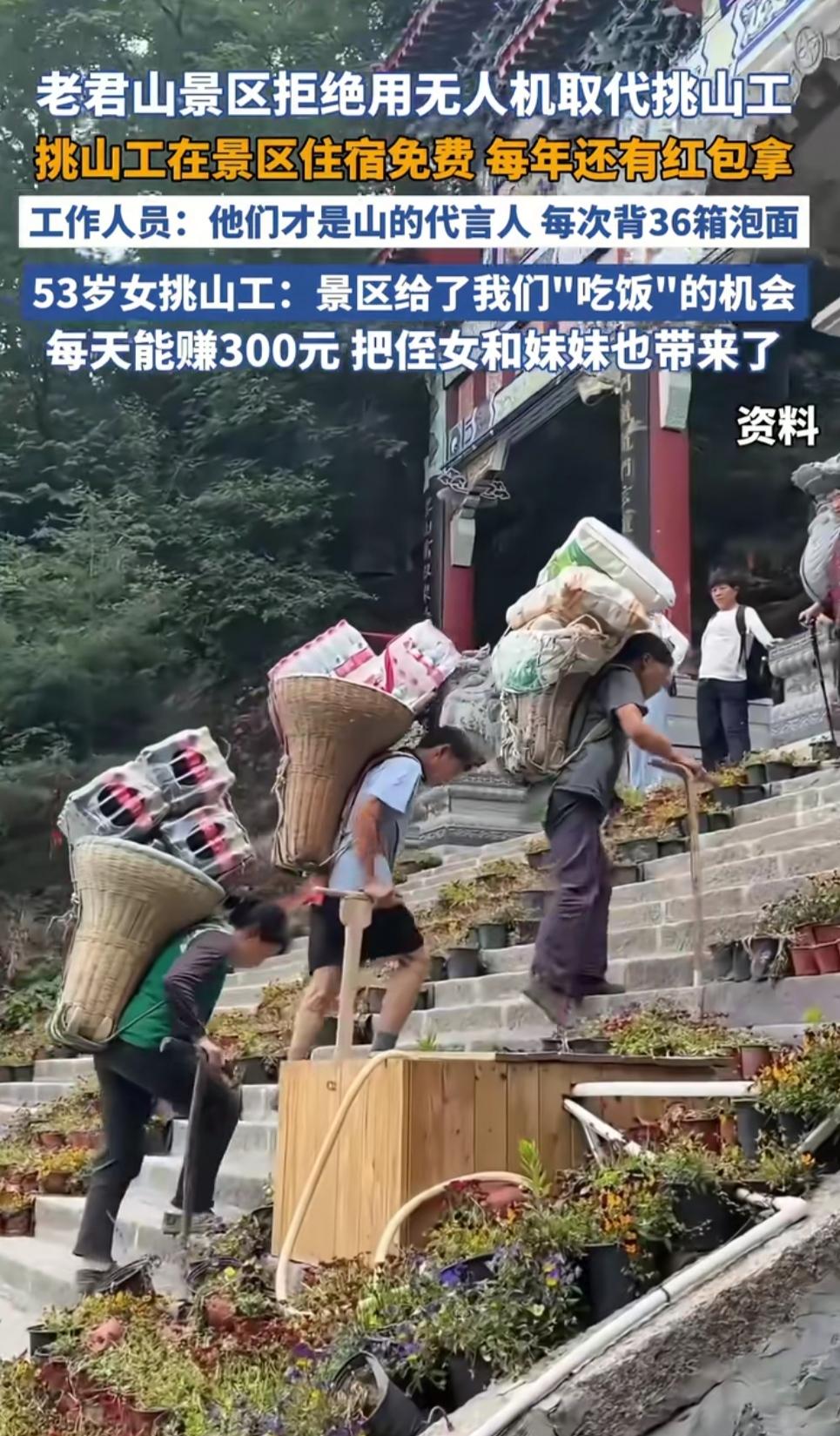 老君山这波操作刷屏了!明明无人机运货又快又省力,景区却偏偏拒绝,不为别的,只为给挑山工们留一份生存的机会。 天刚蒙蒙亮,挑山工的身影就出现在老君山的石阶上。几十斤的物资压在肩头,汗水浸湿衣衫,脚下的台阶被他们磨得发亮。这些靠力气吃饭的人,没什么过人技艺,爬山送货就是他们养家糊口的全部依靠。 有人算过账,无人机能省一半成本,可景区却说:“效率能等,民生不能等。” 科技的进步不该以挤压普通人的生路为代价,那些看似“落后”的坚守,其实是给底层劳动者最实在的体面。 这个时代总在追捧“更快更强”,但老君山的选择让我们明白:真正的文明,不是淘汰旧的,而是让每个人都有立足之地。