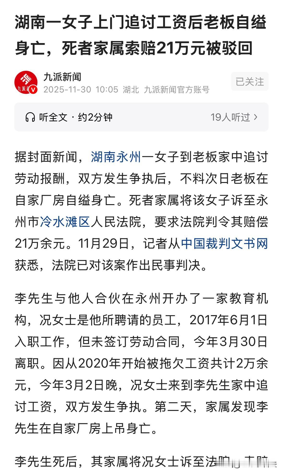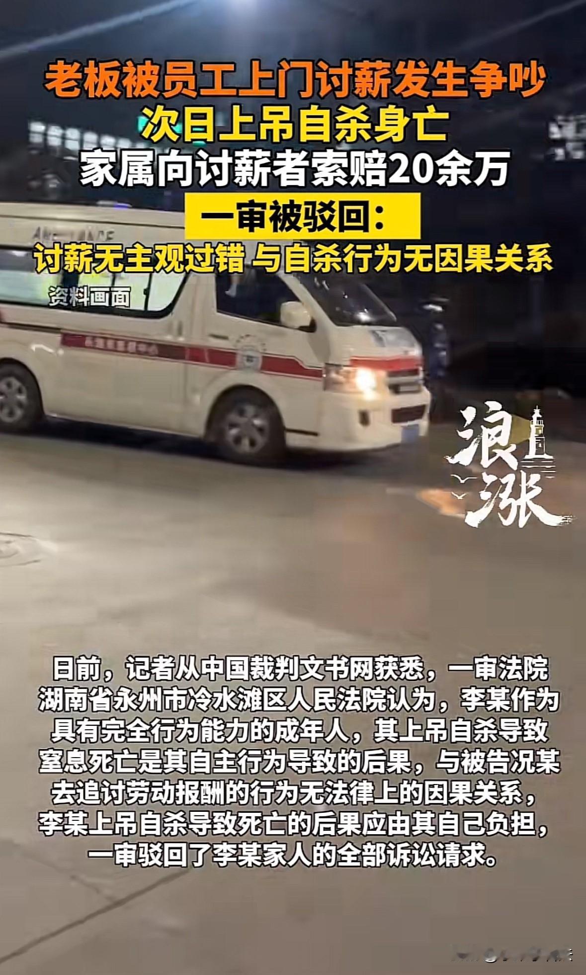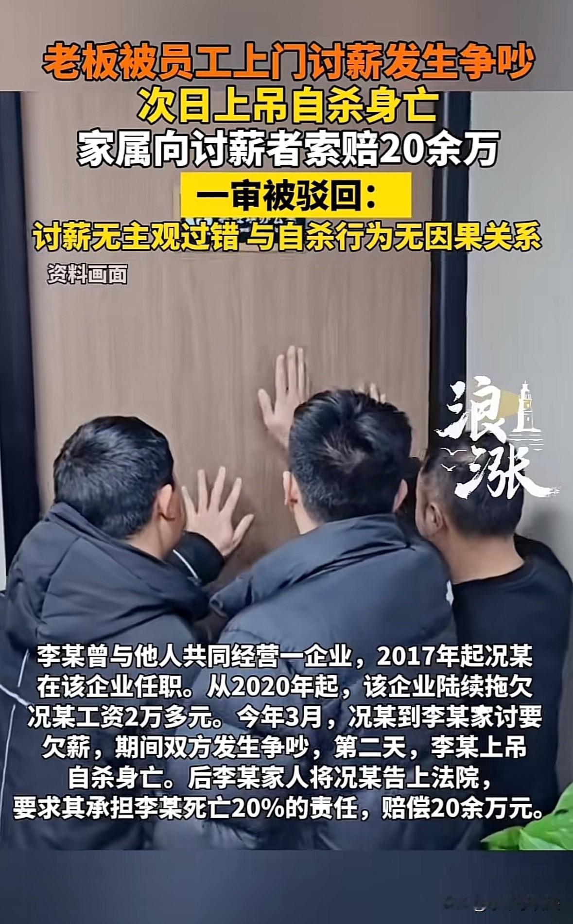 湖南永州,女子到老板家里讨薪未果后离开,次日老板在自家厂房里自缢身亡。事后老板家属将女子起诉索要赔偿21万元,认为是女子的讨薪行为刺激了老板,女子应承担侵权赔偿责任,女子辩称是老板妻子言语中伤给老板造成了身心伤害,法院这样判决。   况女士被公司拖欠2万余元工资5年不给,上门找老板李先生讨要未果,还被老板的太太给告上法庭索赔21万元,况女士觉得很委屈。   况女士在2017年6月1日就开始在李先生和别人合伙开的教育机构里工作,一直都很稳定,工资也没有过拖欠的情况。   但是自从2020年开始,公司就没有再给况女士开过工资。因那段时间比较特殊,况女士对公司的状况也很理解,所以就等着公司好转后再补齐工资就可以,没有追要过。   但是特殊时期过去后,公司已经很久没有发放工资,而且还没有说法。   2025年3月2日晚,况女士仍然没有收到公司发放的工资,实在是无法忍受,就来到李先生家里讨薪。   况女士是公司的老员工了,李先生也认可况女士的工作能力,也不是想要克扣况女士的工资,只是因为在2024年9月份突发脑梗后失忆,没办法核对机构账目。   李先生患脑梗住院治疗的事情,况女士倒是了解一些的,但是并不知晓李先生因此失忆了,而且为什么就对机构的账目这部分失忆了?   就算2024年脑梗导致的失忆,但是拖欠的工资是从2020年开始的,那么前4年为什么没有给发放工资,李先生却给不出来一个合理的解释。   李先生的家里不止有李先生本人,还有他的妻子。就在况女士跟李先生据理力争的时候,李太太没少在一旁帮腔,还多次出言讥讽。   公司拖欠况女士5年的工资,共计2万多元。因当年入职的时候没有签订劳动合同,而且公司也没有拖欠工资的情况,所以况女士就没有想过要补签劳动合同。   如今李太太认为既然没有劳动合同,而且5年的工资就只有2万多元,况女士要是真有能力的话,也就不会在公司磨蹭到5年后才来讨要工资。   况女士气愤的与李先生和李太太争吵起来,期间还报过警,警方赶到后,对双方进行劝阻,双方的情绪才得以平息。   后来况女士就离开了李先生的家里,直到后来才得知,在况女士离开的第二天,李先生在自己家里的厂房自缢身亡。   没过多久况女士就收到法院的传票,李先生的家属将况女士告上法庭,认为李先生自缢身亡是被况女士刺激所致,要求其赔偿21万元。   李先生的家属对于当天况女士前往李先生家里讨薪的情况,是这样叙述的:   首先,况女士是未经许可,擅自闯入李先生家里进行讨薪的行为,还在讨薪的过程中对李先生夫妻进行辱骂,导致李先生的情绪极度激动。   其次,况女士讨薪不成,就到李先生家的厨房里要搬东西抵债,还强制要求李先生和李太太签署汽车和房屋的抵押协议。   况女士把李先生的家里和车子进行了拍照,还要开走李先生的车子。李先生和李太太拒绝签署抵押协议后,况女士对李太太使用掐脖的暴力行为。   通过况女士多种刺激李先生情绪的行为可以推断,李先生的自缢身亡完全都是被况女士刺激导致的。   根据《民法典》第1165条的规定:行为人因过错侵害他人民事权益造成损害的,应当承担侵权责任。   依照法律规定推定行为人有过错,其不能证明自己没有过错的,应当承担侵权责任。   况女士暴力讨薪的行为是导致李先生自缢身亡的诱因,况女士存在过错侵权责任,因此就应该承担过错侵权造成的赔偿,要求况女士赔偿21万元。   况女士辩称,李太太所描述的当天讨薪的行为不符合实际情况,况女士解释的实际情况是这样的:   况女士先给李先生打电话询问能不能当面商讨一下工资的问题,在李先生允许后,况女士才来到李先生家里讨薪。   况女士并没有对李先生和李太太进行辱骂,而且也没有刺激李先生的任何行为。   反而是在况女士讨薪的过程中,李太太多次有言语中伤李先生,其行为给李先生造成了身心伤害。   讨薪的过程中肯定会爆发争吵,但况女士报警处理过,并没有采取过其他过激的行为,因此李先生的自缢身亡与况女士并无关系。   法院经过调查,根据警方出警的记录可以得知,况女士上门讨薪的行为是经过李先生允许的,虽然在讨薪过程中爆发争吵,但经过民警调解后,双方情绪都得到缓和。   在双方情绪稳定后,表示关于工资发放的问题,自行协商处理。   李先生作为完全民事行为能力人,自缢导致的窒息身亡应该承担全部的后果,与况女士上门讨薪不存在法律上的因果关系。   因此,法院认为李先生的自缢身亡与况女士的讨薪行为无关,况女士不存在侵权行为,驳回李先生家属的全部诉求。   好在况女士在讨薪的过程中很理智,没有做过过激的行为,要不然真的就有可能给自己招来不必要的麻烦。