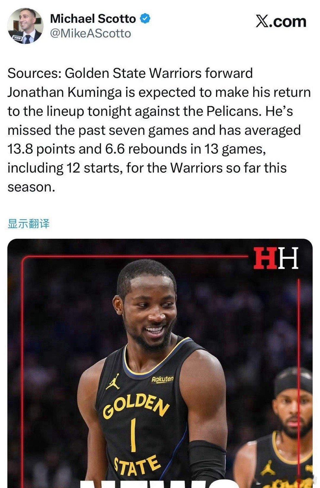 库里伤缺我就复出!据权威记者Michael Scotto报道:勇士队球员库明加将于今天对阵鹈鹕队的比赛中迎来复出,此前他因膝盖髌腱炎连续缺席了7场比赛。库明加的复出节点有点耐人寻味,此前勇士队多次询问他及他的团队,都没有得到具体时间的回复,而库里刚刚受伤需要缺席至少一周的比赛,库明加就火速复出了。看来,库明加是真的非常想证明自己!