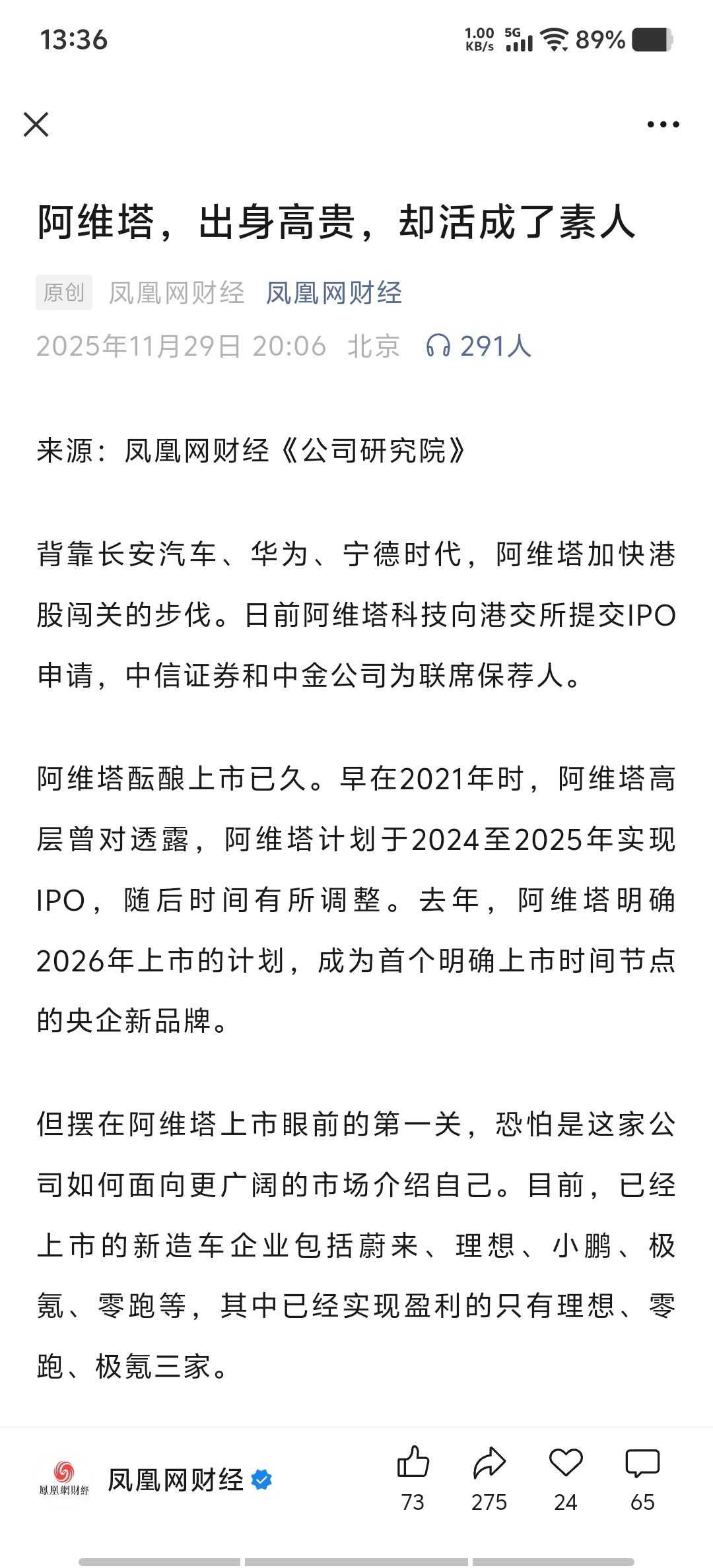 阿维塔,出身高贵,却活成了素人。极为精辟的凤凰网财经解读!背靠长安汽车、华为、宁德时代,阿维塔已经向港交所提交IPO申请,中信证券和中金公司为联席保荐人。阿维塔酝酿上市已久,但是销量摆在那里,如何面向更广阔的市场介绍自己,是阿维塔一大难点。百家车坛
