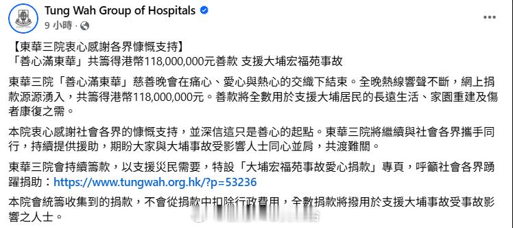 明报:《东华》共筹1亿1800万善款 曾志伟捐300万 肥妈带泪领唱TVB慈善节目《善心满东华》昨晚(29日)在电视城举行,在晚间新闻之前,善款数字为97,055,407港元,TVB总经理曾志伟在大合唱后现身,他表示略尽绵力,与富声文化公司合共捐出300万港元,令善款数字突破1亿,该时段的善款数字为100,055,407港元。而整晚《善心满东华》筹得的总善款为港币118,000,000元,以支援大埔宏福苑事故,东华三院的社交平台专页亦贴出善款总数。另外,在曾志伟现身之前,肥妈Maria Cordero率领艺人及歌手合唱改词版的《真的英雄》,向前线救人英雄及为出心出力的市民致敬,司仪邓梓峰和区永权也强忍泪水,何沛珈忍不住拭泪,肥妈亦唱到落泪,献唱期间她边唱边抹眼泪。