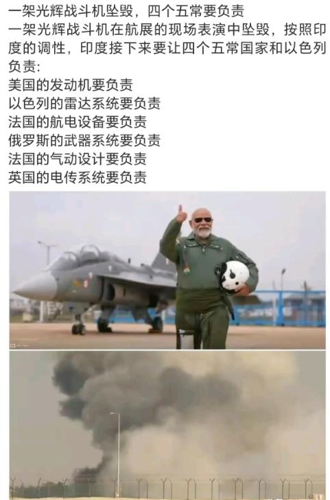 印度前空军司令称“光辉”战机坠毁或系蓄意破坏引热议 印度前空军司令近日的一番话,让“光辉”战机坠毁事件再次成为焦点。 他公开表示,这架国产战机在迪拜航展上的坠毁可能源于“蓄意破坏”(但印度空军和国防部均未认可此说法),还称“因为印度科技实力快速提升,多国正联手针对印度”,这话一出来就引发了各方讨论。 事情得从11月21日说起,迪拜航展最后一天,编号LA-5026的“光辉”MK1A战机正在做飞行表演,37岁的资深飞行员西亚尔中校驾驶着它完成低空特技时,突然失控俯冲坠地爆炸,飞行员没能弹射逃生。 现场视频里,战机在负G转弯后就没改过来,直直砸向地面,升起几十米高的火球。 更巧的是,事故前4天,另一架编号LA-5025的“光辉”在静态展示时,机腹往下滴液体,地勤居然用商场购物袋接着。 网友质疑是漏油,印度新闻信息局赶紧辟谣,说那是冷凝水,还说是“蓄意抹黑”,可没给任何检测证明。 有不愿具名的地勤跟《印度斯坦时报》说,战机用的美国F414发动机,之前在国内训练就漏过3次油,都只是临时换密封垫。 前空军司令的“蓄意破坏论”出来后,不少人觉得站不住脚,印度空军已经成立调查委员会,重点查飞行控制系统、软件故障和发动机性能这些,连人工智能都用上了。 国防部长辛格只说为飞行员遇难悲痛,没提破坏的事,国防部也只是强调在查事故原因,没认可“多国针对”的说法。 “光辉”战机从上世纪80年代开始研发,2016年才服役,2024年就出过一次坠毁事故。 这次迪拜航展本是它闯国际市场的好机会,结果出了这事,现在大家都在等黑匣子的最终结论,毕竟比起猜测,实打实的证据才更有说服力。 以上都是个人观点,对此您有什么不同的看法,可以在评论区留言讨论!!!