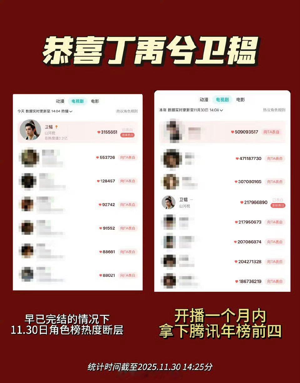 丁禹兮卫韫山河枕开播一个月内拿下 2025腾讯角色热度榜年度前四!