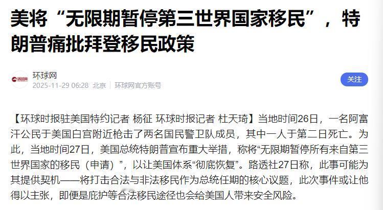 特朗普宣布新政策:让美国“闭关锁国”! 最近特朗普宣布暂停所有第三世界国家移民入境,确实有点“闭关锁国”的意思,但背后藏着的动因和可能引发的连锁反应,确实值得好好琢磨。要搞懂这事儿,得从特朗普为啥要推出这政策说起,绝不是一时头脑发热那么简单。 最直接的由头是白宫附近的枪击案,嫌疑人是阿富汗裔移民。这种极端事件在政治上从来都是敏感点,特朗普抓得很准,立刻把它和移民安全绑定。 在他看来,哪怕是合法进来的移民,也可能藏着安全隐患,所以干脆用“一刀切”的方式暂停入境。 这种逻辑看着是为了安全,其实是把个别极端案例扩大到了整个群体,说白了就是借安全议题做文章,毕竟普通民众对安全问题最敏感,也最容易获得支持。 更深层的原因是政治算计,这和他的竞选承诺直接挂钩。2024年大选时,特朗普就喊着“把美国还给美国人”,他的支持者很多是对现状不满的底层民众,觉得移民抢了工作、分了福利。 现在重返白宫推出这政策,就是兑现承诺给支持者一个交代,稳固自己的基本盘。而且移民问题在美国两党争斗里一直是筹码,共和党向来对移民偏强硬,特朗普这么做也能强化党派立场,把移民议题变成拉拢选票的工具。 从实际反应看,确实有四成左右的美国人支持这种限制,正好印证了这步政治棋的用意。 还有个重要因素是对移民的经济认知偏差。特朗普反复强调移民“依赖福利”“没贡献”,甚至说移民拖垮了医疗和住房。 这种说法其实站不住脚,美国农业、服务业还有不少科技公司,都离不开移民劳动力,每年上百万新移民里,有大量工程师、医生这些优质人才。 但这种实际贡献在政治叙事里很容易被忽略,特朗普放大“移民是负担”的论调,正好迎合了部分民众的焦虑情绪。即便财政部门可能清楚其中利害,也因为政治压力选择沉默,这更说明政策背后的政治考量压过了经济理性。 另外,这政策也透着美国的内部焦虑。这些年美国内部矛盾不少,社会撕裂越来越明显,特朗普把问题归咎于移民,其实是转移矛盾焦点。就像上世纪30年代的孤立主义,本质都是遇到内部问题时,想通过“关门”来解决。 但时代不一样了,现在全球人才流动频繁,美国当年能崛起,靠的就是开放吸引全球人才。现在反过来限制移民,表面是保安全、保就业,实际是对自身吸引力不自信的表现。 说回开头的问题,美国真要闭关锁国吗?暂时还不至于,毕竟只是移民政策的调整,没涉及贸易、科技等全面封锁。 但这政策释放的信号很危险,用模糊的“第三世界国家”定义搞限制,既容易引发国际争议,也会让美国错失人才。 历史早证明,真正强大的国家从不怕开放。特朗普的政策看似强硬,实则是用简单粗暴的方式应对复杂问题,到头来可能既没解决安全和就业问题,反而让美国离世界越来越远,这才是最值得警惕的地方。