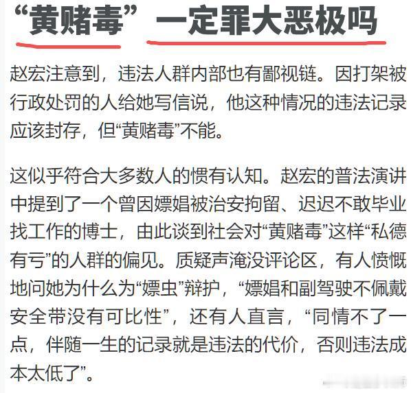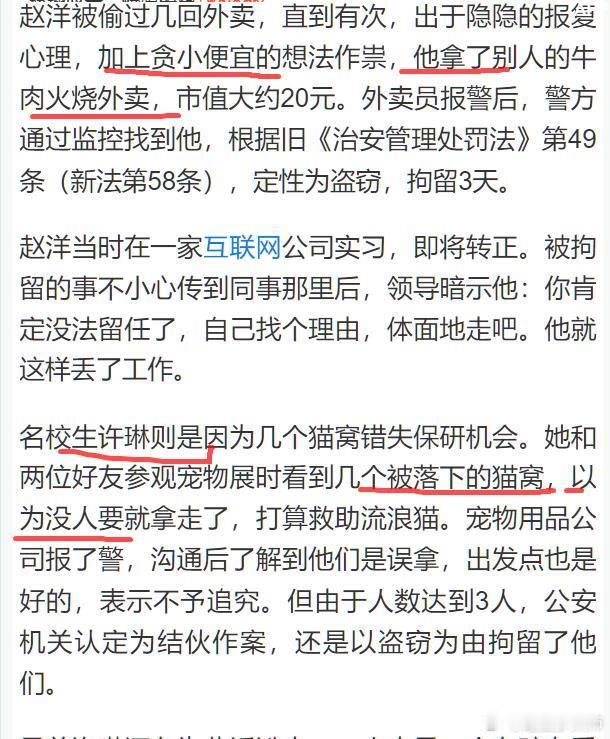 力推治安处罚纪录进行封存的专家说的话,划个重点:被治安处罚的人,怎么就不能考公了?(图1)《黄赌毒一定罪大恶极吗》(图2),大教授,大专家觉得必须关心爱护的人群(图3):《赵洋“拿”别人外卖》《名校生许琳参观宠物展时看到几个被落下的猫窝,以为没人要就拿走了,打算救助流浪猫》《还有个大学生,大风天着急赶路,骑了路边没上锁的一辆自行车,后来忘记了送回去》全部是原文,自己看截图。原文章新浪也转载了:每年超800万人被治安处罚,违法记录或束缚一生?