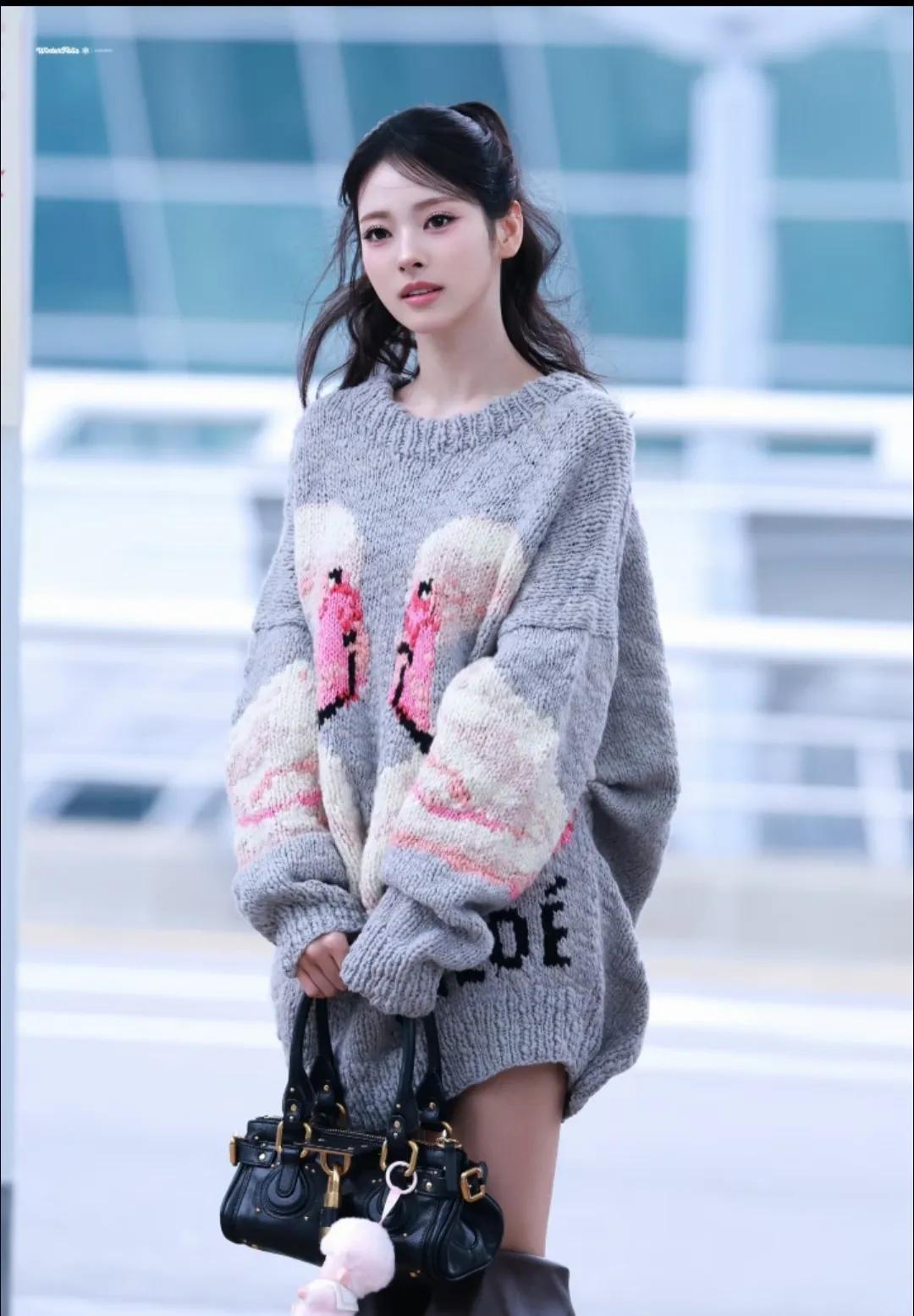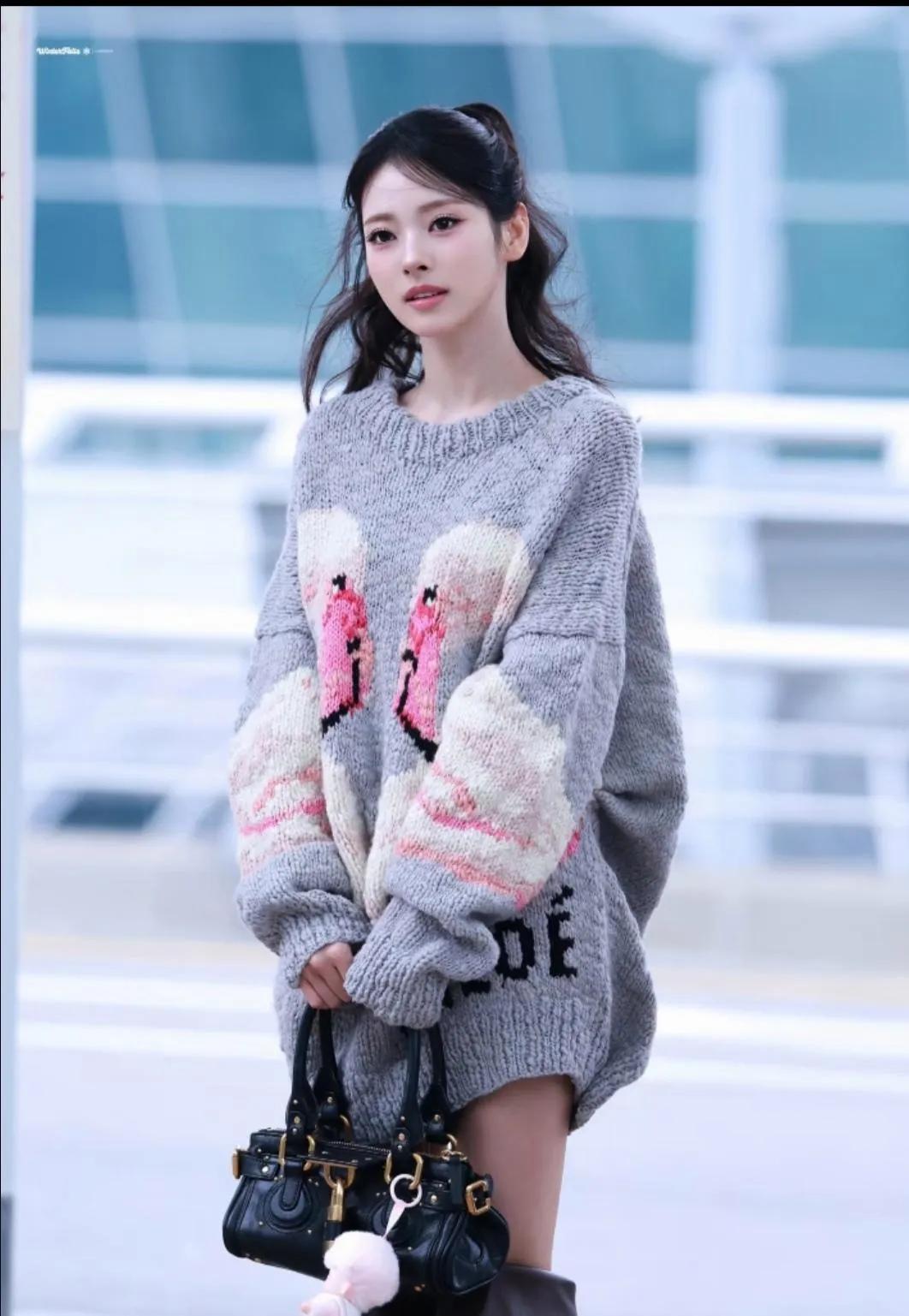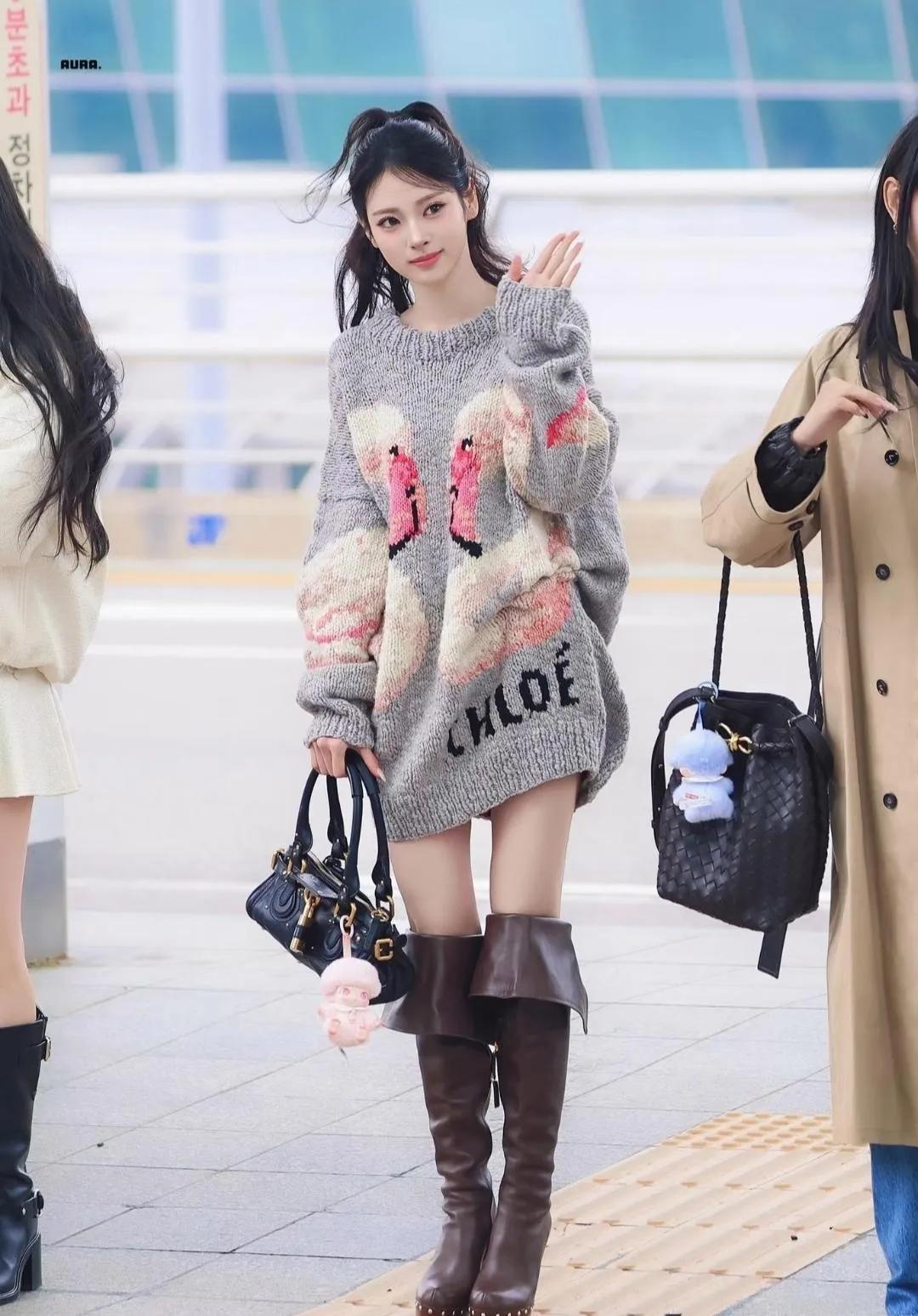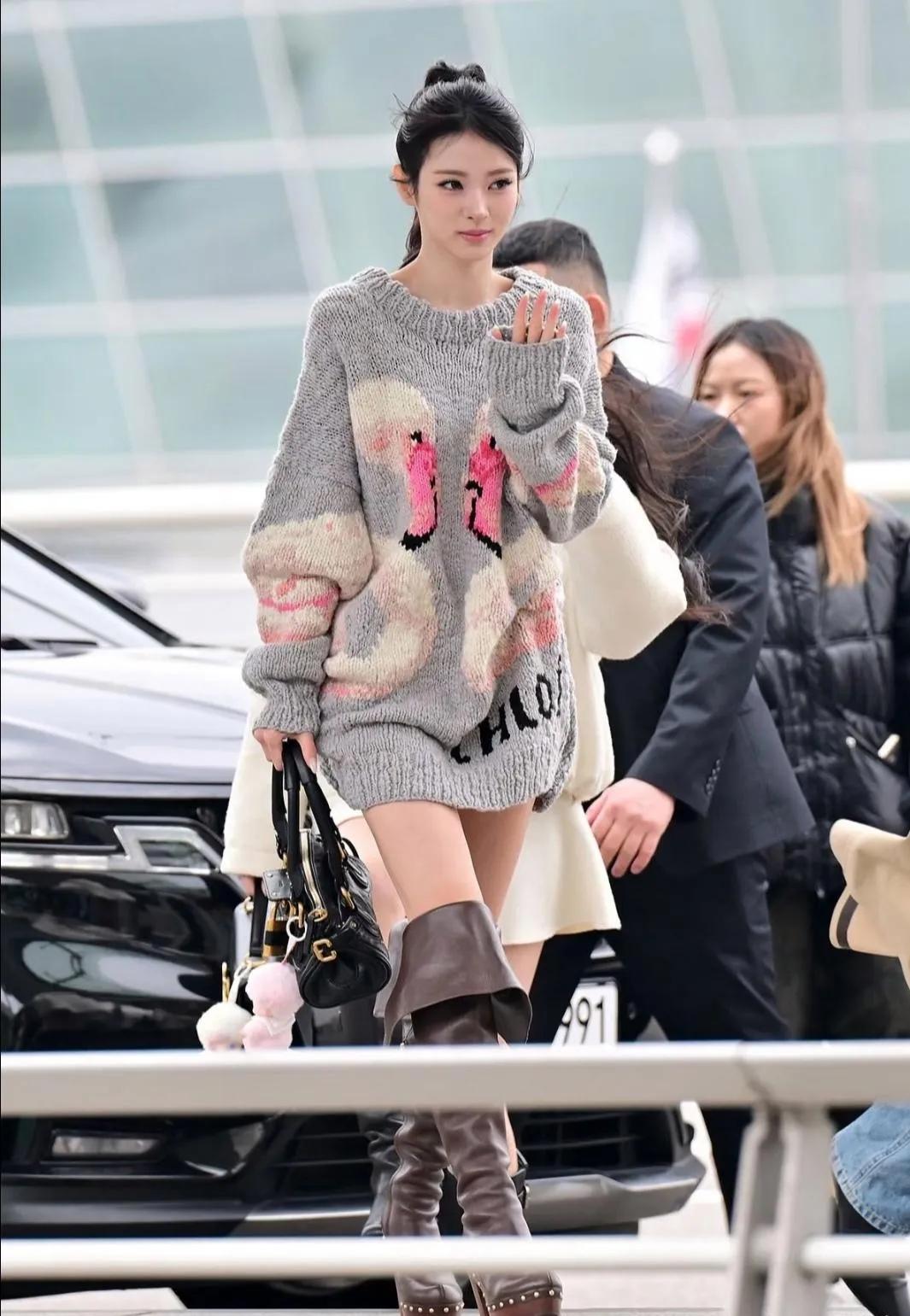 Anna这机场私服杀疯了!软萌毛衣+长靴的比例魔法 Anna这场机场穿搭也太会了吧! 灰调长款毛衣裹着软乎乎的可爱图案,甜得恰到好处✨ 搭双棕色长靴直接把比例拉满——又瘦又高挑,甜妹氛围感里还藏着时髦小心机! 这“慵懒显瘦”的模板,直接焊在秋冬穿搭清单里了~