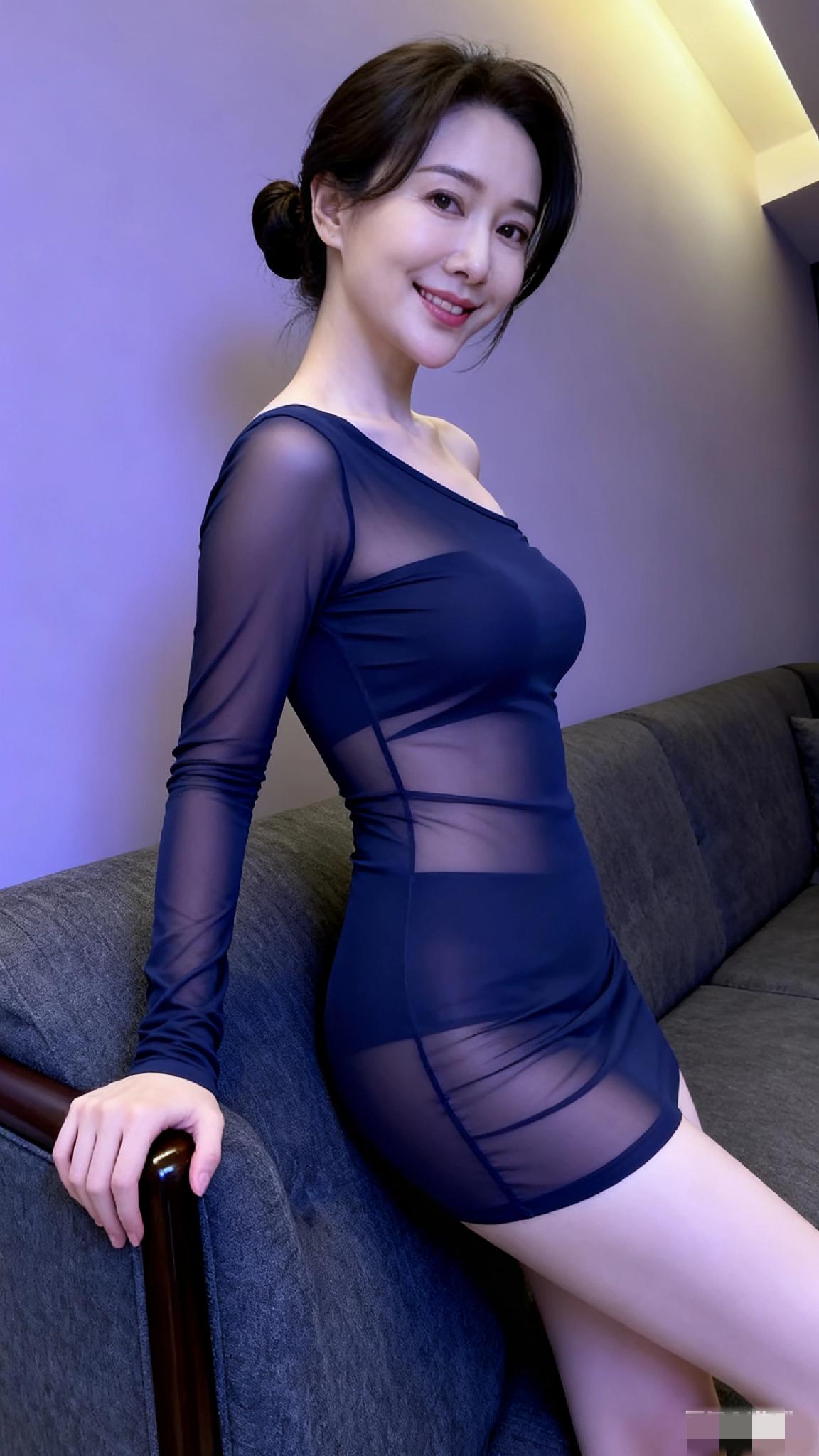 优雅气质,深蓝透视裙,迷人微笑