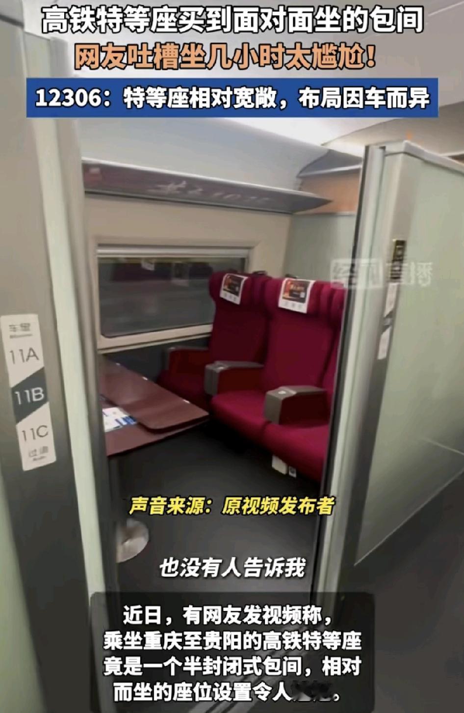 有网友发布视频称,从重庆至贵阳的高铁特等座是一个半封闭的包厢。看是高等的包厢,但是里面是6个座位相对而坐,毕竟买票的人都是不认识的,这样做起来会不会有点尴尬。说是特等座,如果跟不认识的人坐在一块,那还不如坐二等座。
