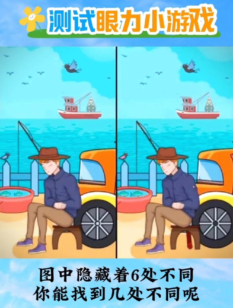 这组海边找不同太考验眼力!钓鱼大叔藏了6处不同,能找全的绝对是火眼金睛,敢来挑战吗?