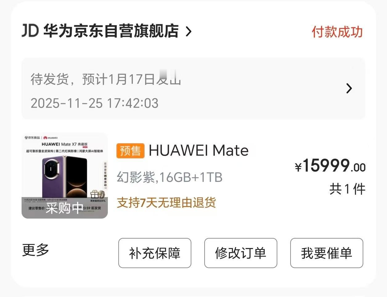 晒一下前两天抢到的Mate X7,这应该是首批发货吧?至尊版的幻影紫,16+1T超大内存,这手速咋样?