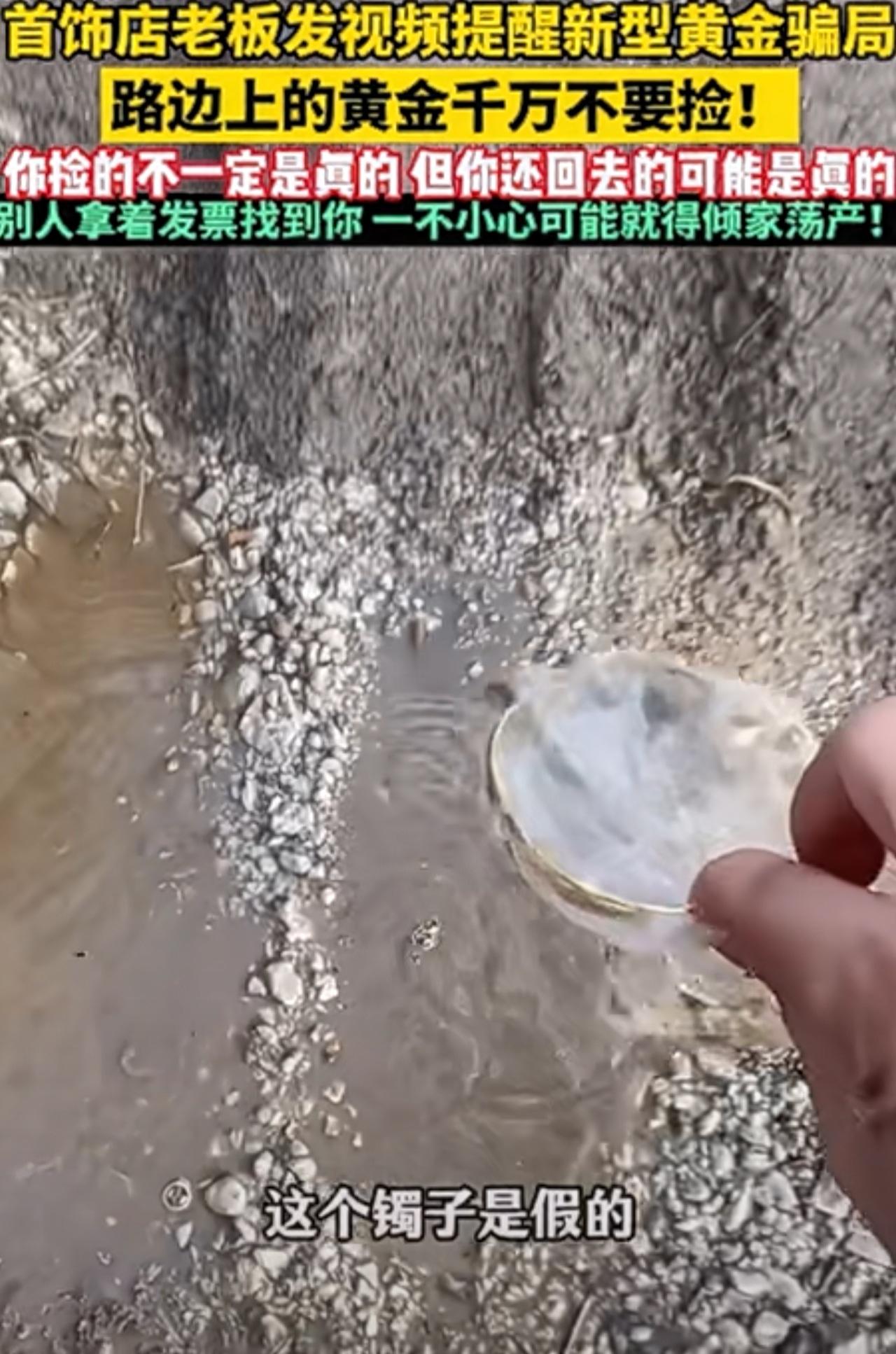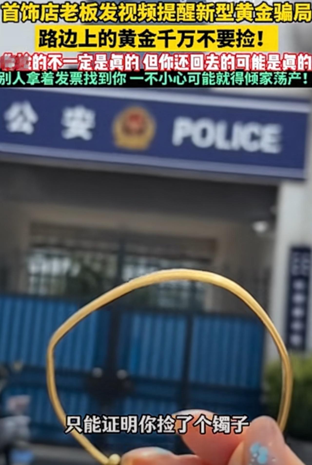 太吓人了,还追到家里骗钱!首饰店老板发视频提醒新型黄金骗局:路边的黄金千万不要捡! 套路:你捡到后,没人问你要,等你回到家,骗子会拿着真的金手镯发票,和监控录像,到你家门口,礼貌的说先生你捡的金子是我的,你这时没办法只能承认认栽,拿出手镯,没想到骗子说这是假的,你脑袋炸了,不想管了,骗子说会报警处理,你害怕影响下半生,打碎牙齿自己咽!有什么好法子吗?