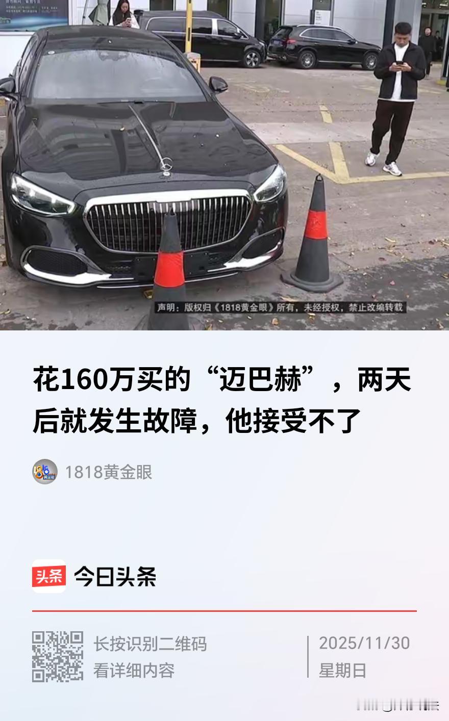 浙江义乌,一男子花费160万买了一辆迈巴赫,从江苏跨省提车后不到两天,第一次驾车去加油站加油时,轻轻带上右后门时,门没像其他三门那样优雅吸合,而是留着缝隙。男子反复试验,唯独这扇门失去了智能吸合功能。男子找到4S店讨要说法,4S店拿出两份交车前检查报告,坚持车辆离店时一切正常。可是,男子也曾将车送去检测,白纸黑字的检测报告,却指认了“功能故障”。4S店提出拆解新车,男子果断拒绝。4S店表态愿意提供额外保修,但需要先确定故障。男子陷入两难,新车要不要动手术?动了,价值受损;不动,真相难明。   据悉,润先生是江苏丹阳的一位生意人,平日里对汽车颇有研究,一直梦想拥有一辆顶级豪车。   2025年11月初,润先生看中了一辆迈巴赫S480轿车,这款车以其奢华配置和精湛工艺闻名,尤其是电吸门功能,轻轻一推便能自动闭合,彰显尊贵体验。   但由于这款车紧俏,多地4S店均无现车,润先生多方打听后,得知浙江义乌一家公司有库存。   尽管距离遥远,润先生仍毫不犹豫地决定跨省购车。   11月10日,润先生通过拖车服务,将这辆落地价160万元的迈巴赫从义乌运至江苏丹阳。交车当天,他满怀兴奋地检查了车辆外观,漆面光洁、内饰豪华,一切看似完美。   润先生当时只注重了整体观感,并未逐一测试电吸门等细节功能,毕竟,这是一辆崭新的豪车,谁又会料到它会有隐藏问题呢?   提车时,4S店出示了两份售前检查报告,均显示车辆状况正常。   两天后,即11月12日,润先生准备首次驾驶这辆迈巴赫去加油站,就在他轻轻推闭右后门时,意外发生了,其他门都能自动吸合,唯独这扇门留下一条缝隙,无法完全闭合。   润先生试着用力手动关门,门虽能关上,但失去了那种“优雅”的自动感。   他顿时心里一沉,这辆还没正儿八经开过的新车,竟在短短两天内出现故障。   润先生立即联系了4S店,并前往当地的授权维修点检测,技术人员出具了一份初步报告,指出“车门锁存在功能故障,存在一个一般电气故障”。   润先生感到难以接受,花160万元买的豪车,竟像普通二手车一样需要维修?他担心,这不仅是小毛病,还可能涉及更深层的质量缺陷。   更让他不安的是,如果现在接受维修,未来是否会有更多问题浮现?   11月16日,润先生再次用拖车将迈巴赫运回4S店,希望讨个说法。   在公司展厅,客户权益官金经理立场坚定:公司交车前已进行两次PDI检查,均未发现电吸门问题,并怀疑故障可能是在运输或使用中发生的。   金经理建议对车辆进行拆解检查,以确定具体原因。   但润先生坚决反对拆检,并质疑道:新车买回家现在给我拆掉,你愿意吗?我肯定不愿意。   润先生坚持要求退换新车,而非简单维修,他认为,根据消费者权益,高价商品在短期内出现严重故障,理应享受退换服务。   金经理则回应,公司理解客户心情,但需依据程序处理,他提到,此类故障在该车型中极为罕见,公司愿意提供后续保修和保养服务作为补偿,但退换车需符合厂家政策。   双方各执一词,谈判陷入僵局。   润先生无奈之下,求助媒体,希望曝光能推动问题解决。   目前,金经理反馈,车辆已开始维修检查,公司承诺提供维保保障,但润先生仍无法释怀。   那么,从法律角度这件事如何评价呢?   《家用汽车产品修理更换退货责任规定》第二十四条规定,家用汽车产品在三包有效期内出现下列情形之一,消费者凭购车发票、三包凭证选择更换家用汽车产品或者退货的,销售者应当更换或者退货:1.1. 因严重安全性能故障累计进行 2 次修理,但仍未排除该故障或者出现新的严重安全性能故障的;……4.4. 因质量问题累计修理时间超过 30 日,或者因同一质量问题累计修理超过 4 次的。   司法实践中,“严重安全性能故障”通常指涉及行驶、制动、转向等直接影响生命安全的系统故障。   本案中,电吸门属于提升舒适性与豪华感的配置,其失灵虽严重影响用户体验,但手动仍可关紧车门,不影响车辆的基本安全行驶功能。   因此,“电吸门功能失效”更可能被归类为“一般质量问题”或“瑕疵”。   而且,因润先生拒绝拆检,车辆尚未进行任何正式修理,远未达到“同一质量问题修理超4次”或“累计修理时间超30日”的法定门槛。   所以,仅就目前披露的“电吸门故障”这一单一事实而言,它很可能不符合现行“汽车三包规定”中关于直接退换车的强制性法定条件。   此外,润先生拒绝拆检,是基于对新车完整性和价值可能受损的合理担忧,这在情理上是完全可以理解的。   不过,不进行拆检,就无法最终确定故障的根本原因,润先生可能要承担因举证不能而带来的不利后果。   接下来,润先生可以选择协商方式处理,如协商不成,可提起诉讼,主张经销商承担违约责任,赔偿损失。届时,法院可能会委托司法鉴定来确定故障原因和责任。   对此,您怎么看?
