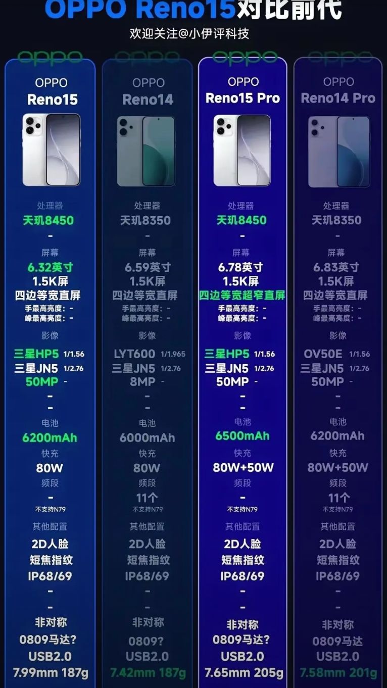OPPO Reno15 Pro对比Reno14 Pro,那升级可太明显了。影像上,Reno15 Pro把后置主摄升级成2亿像素三星HP5-1/1.56英寸摄像头,拍照更清晰。屏幕也有大变化,实现1.15mm极窄四等边,全局激发最高亮度提升至1800nit,还能1 - 120Hz智能切换刷新率,视觉体验超棒。 续航上,电池容量增加300mAh达到6500mAh,还支持旁路供电。传输方面,新增支持7个5G网络频段,还搭载了Wi-Fi加速芯片。不过,它机身厚度和重量稍有增加,价格也上调了。但整体来看,这些升级还是很值得的,性能和设计全面提升,香!
