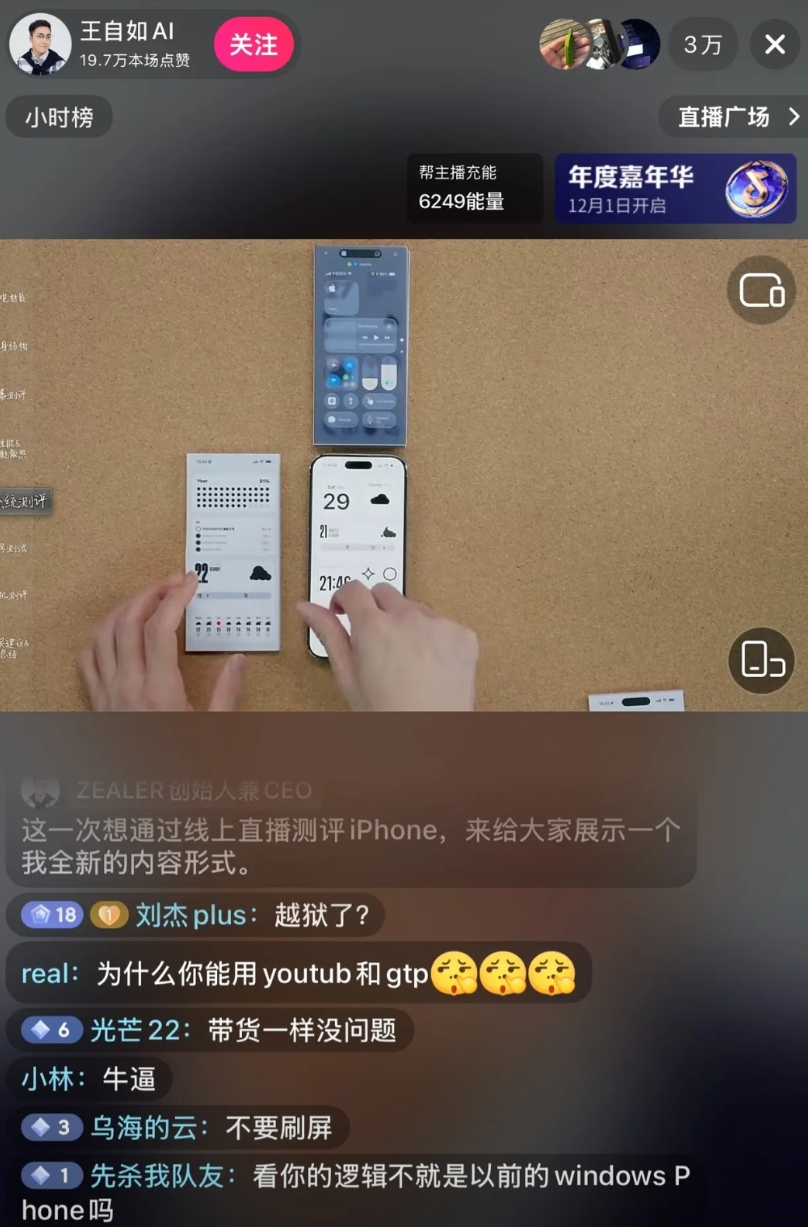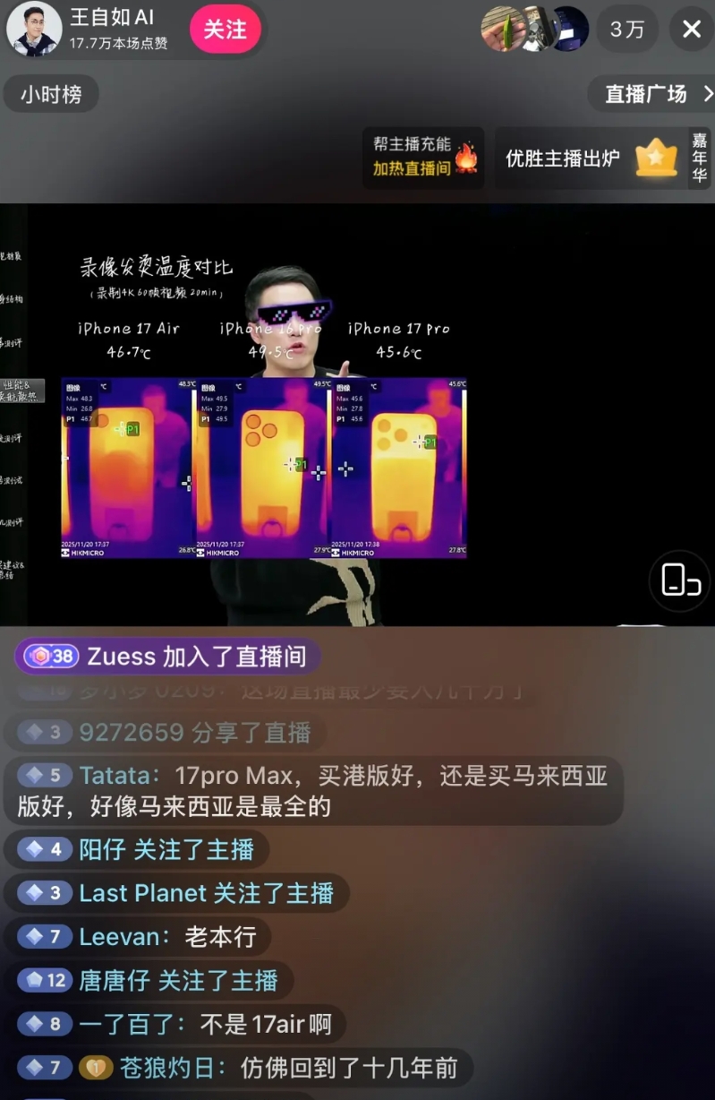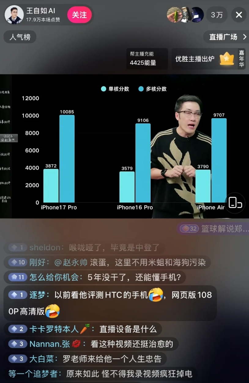 刚看了下王自如在抖音直播测评iPhone17系列,好家伙,直接有3万人观看,作为曾经的老粉,还是刷了几个小心心,以表示支持!