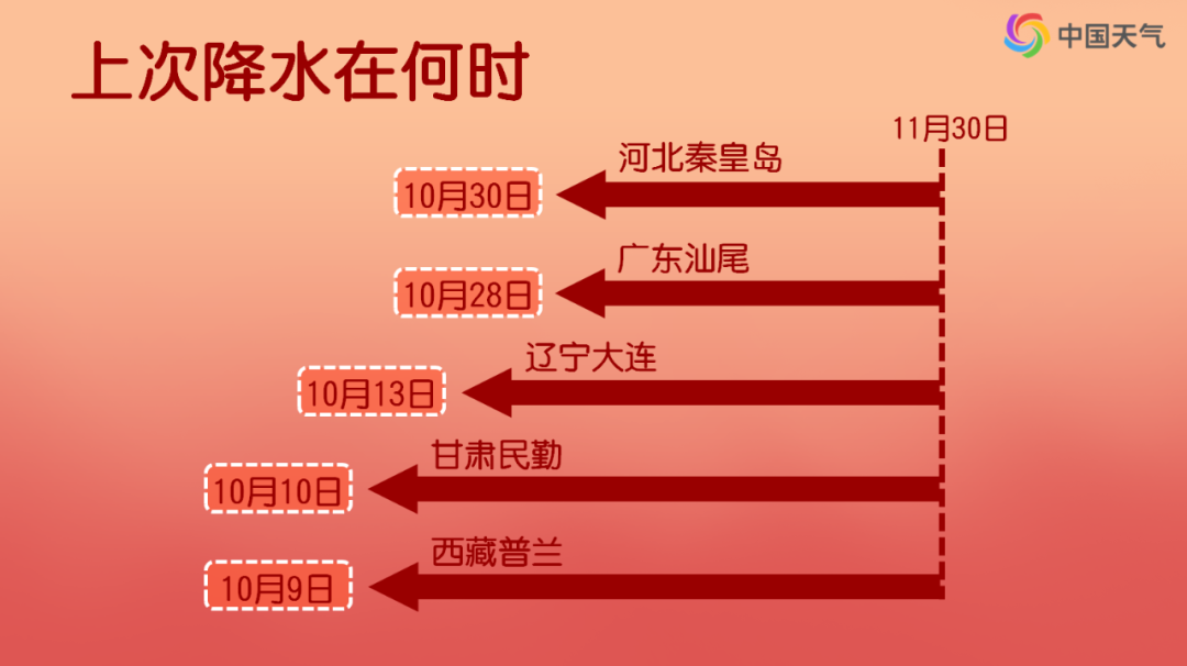 11月以来,北方多地降水不多,尤其是辽宁、山东、河北东北部、陕西多地降水明显偏少,像是辽宁大连、旅顺,河北秦皇岛、承德,山东滕州都是滴雨未下。在南方广东沿海降水也是显著偏少,广东汕尾11月滴雨未下,较常年同期的27.4毫米显著偏少,空气偏干燥,这与冷空气频繁影响也相关。