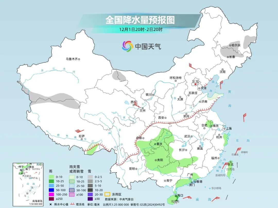 北方降温主要在11月30日-12月2日,南方降温主要在12月2日-3日。12月4日早晨,最低温度0℃线将南压至浙江中部、安徽南部、湖北北部一带。